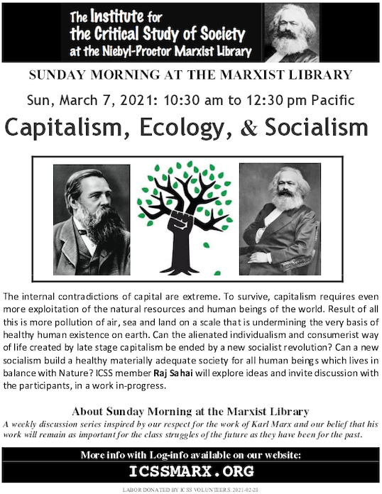 Forest fires in California, thawing of ice in the arctic, Glacier melting in The Himalayas, floods and bitter cold in Texas; and the Covid pandemic are all tied to the global warming from cumulative effects of capitalist commodity production over the past 200 years. Air pollution in much of world has worsened. Since the collapse of the USSR in 1991, and China taking the role of a biggest commodity producer for the world; other than tiny Cuba, there is no model of development that does not contribute to worsening of the ecological crisis all over the world. Class differentiation is leading to right-wing populism, threatening social peace in many countries. The internal contradictions of capital are extreme. To survive, capitalism requires even more exploitation of natural resources and human beings of the world, witness the farmers fighting capitalist predation laws in India. Result of all this is more pollution of air, sea and land on a scale that is undermining the very basis of healthy human existence on earth. Can the alienated individualism and consumerist way of life created by late stage capitalism be ended by a new socialist revolution? Can a new socialism build a healthy materially adequate society for all human beings which lives in balance with Nature?