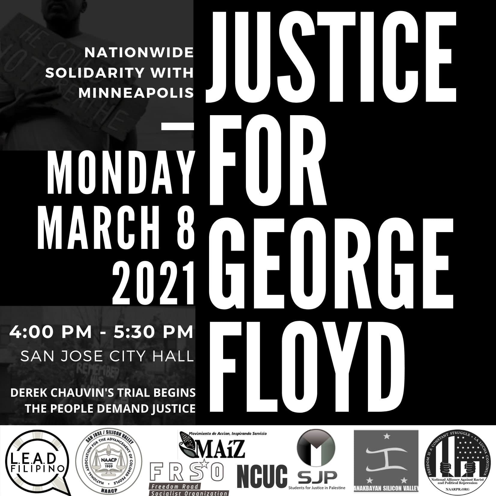 On the first day of the trial, Minnesota organizers will hold a mass protest outside the Hennepin County Government Center. In solidarity with this action, LEAD, NAACP, MAIZ, NCUC, FRSO, NAARPR, and partners are holding a rally at San Jose City Hall to demand justice for George Floyd. Police brutality is an undeniable issue across the country, and