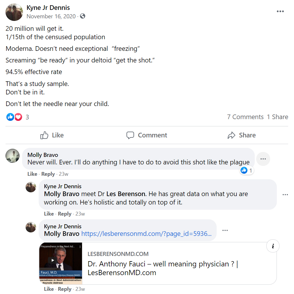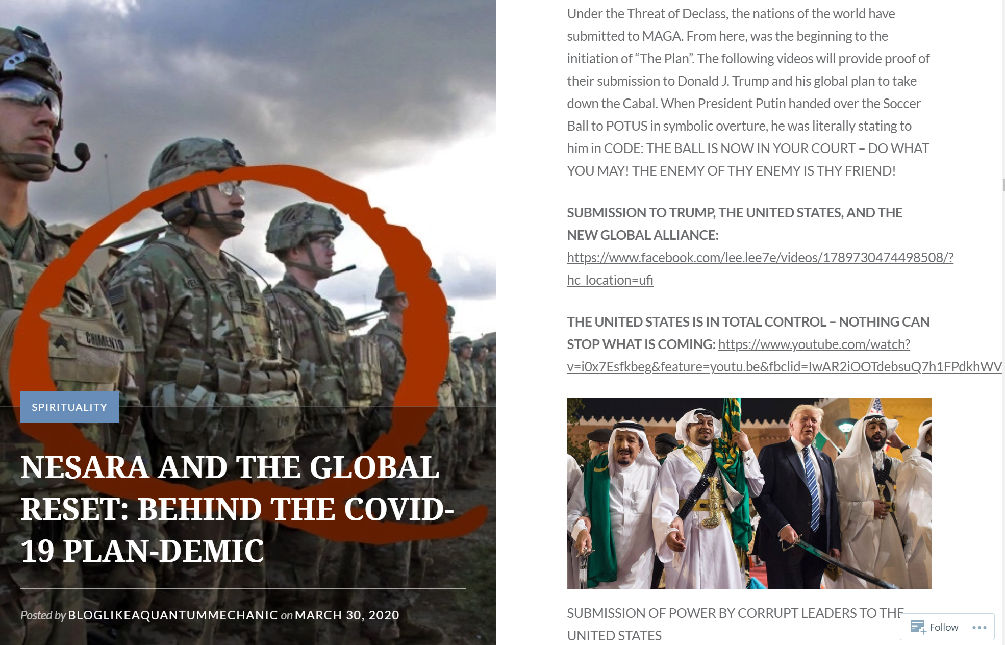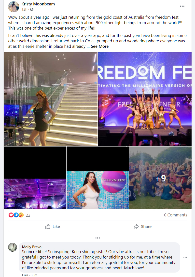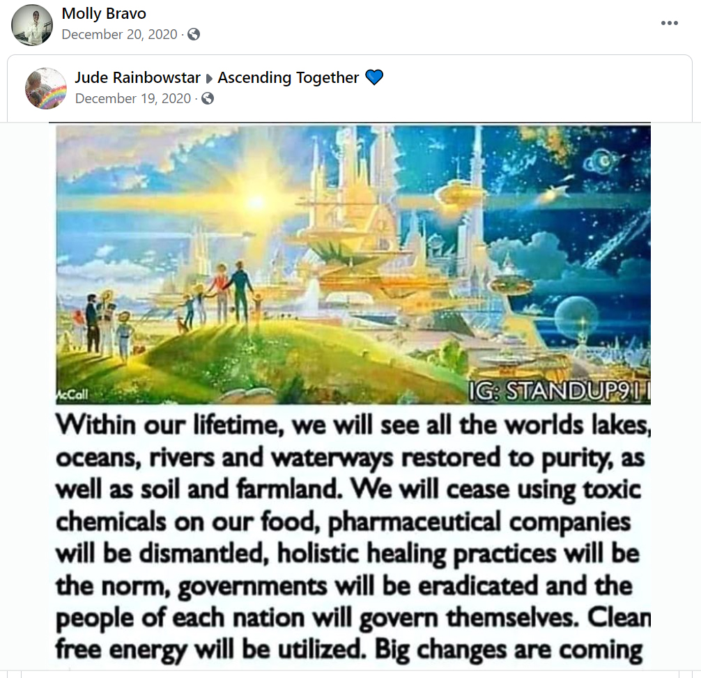 During the past five years of going down the "rabbit hole," as Molly Bravo called it, she has also posted about the anti-vaccination movement, and more recently she has referenced the terms "the great awakening" and "spiritual revolution" to describe the current times.