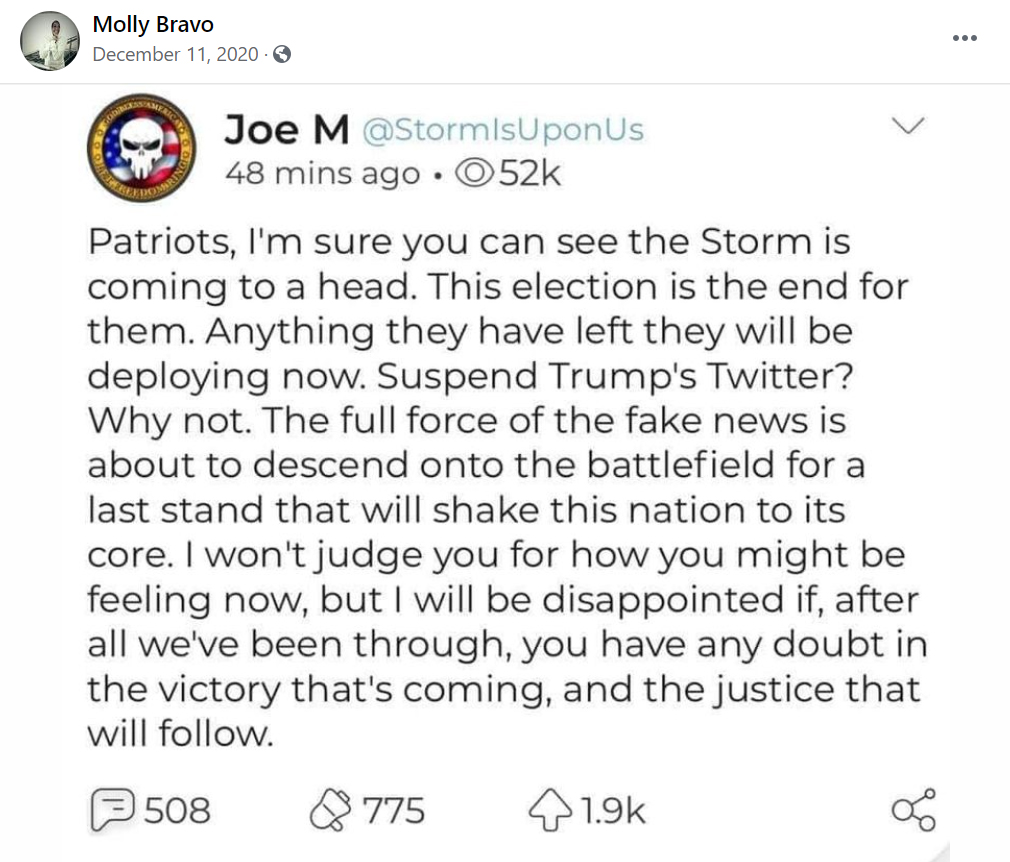"Patriots, I'm sure you can see the Storm is coming to a head. This election is the end for them. Anything they have left they will be deploying now. Suspend Trump's Twitter? Why not. The full force of the fake news is about to descend onto the battlefield for a last stand that will shake this nation to its core. I won't judge you for how you might be feeling now, but I will be disappointed if, after all we've been through, you have any doubt in the victory that's coming, and the justice that will follow."