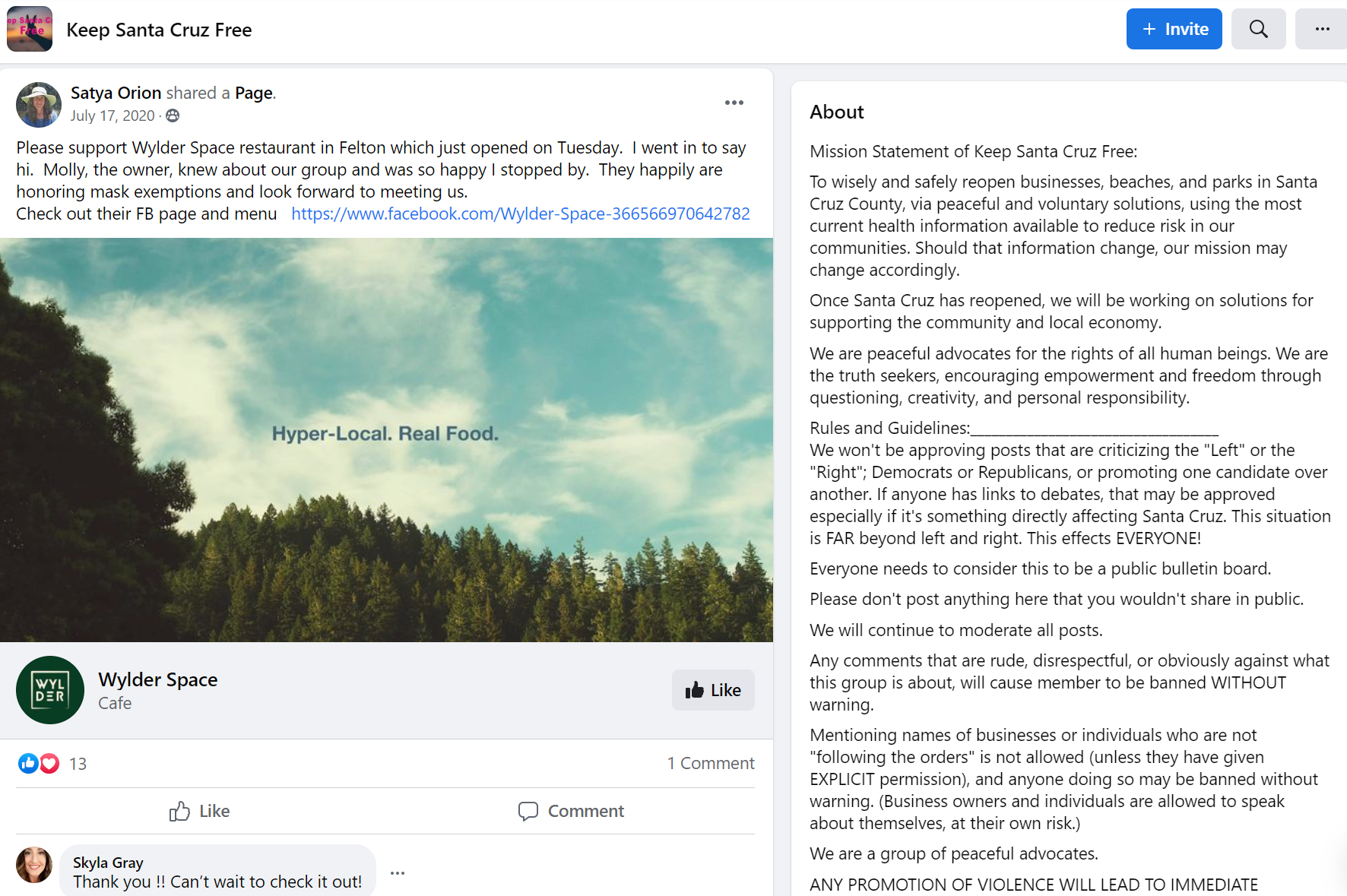 Anti-mask activist Satya Orion posted this message to the Keep Santa Cruz Free online group in July of 2020: "Please support Wylder Space restaurant in Felton which just opened on Tuesday. I went in to say hi. Molly, the owner, knew about our group and was so happy I stopped by. They happily are honoring mask exemptions and look forward to meeting us."