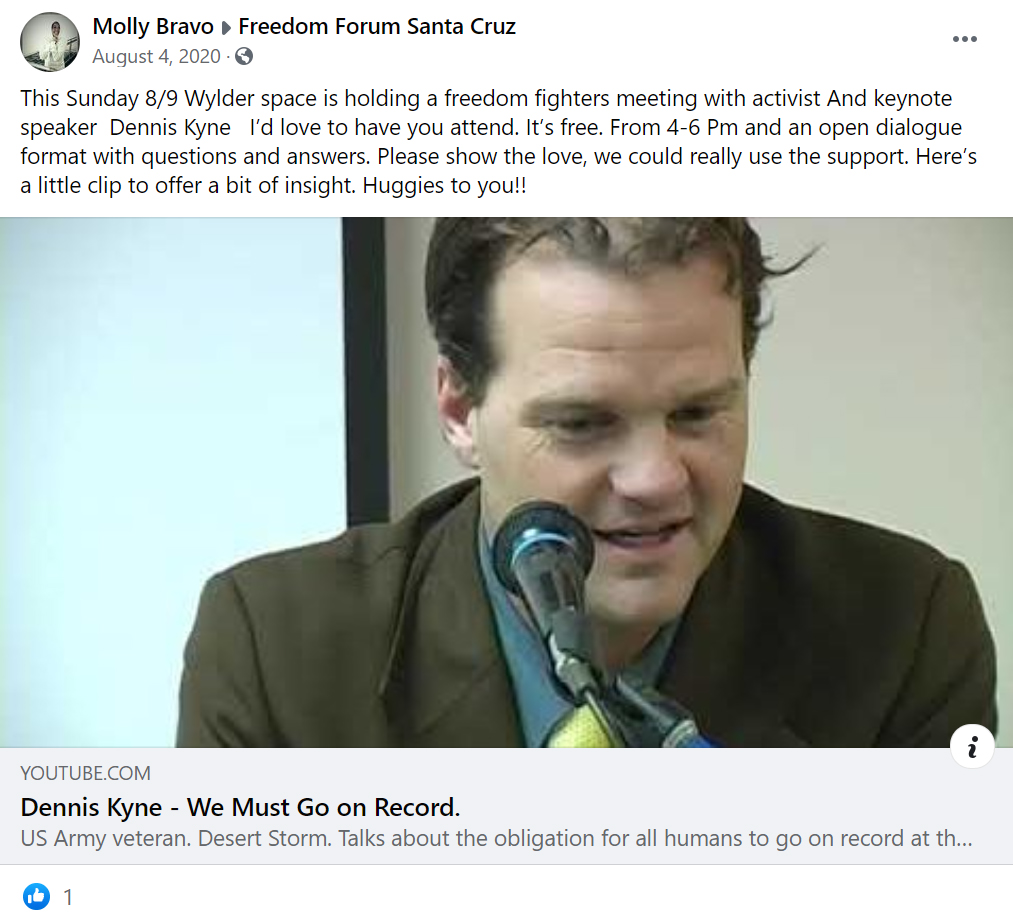 On August 4, Bravo posted about Wylder Space's "freedom fighters meeting" to the "Freedom Forum Santa Cruz" page on Facebook. In the post, Bravo included a link to a video of the featured speaker, Dennis Kyne. The video was filmed at a "9/11 truth" conference. Kyne is a former Gulf War veteran who delves into conspiracy theories.