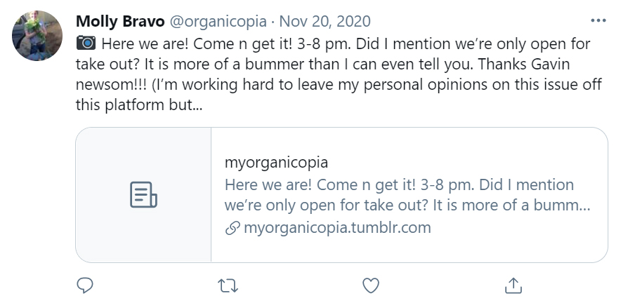 Shortly after Wylder Space opened a brick and mortar restaurant in Felton in July of 2020, during the height of the Covid-19 pandemic, chef and owner Molly Bravo organized a "freedom fighters meeting" at their new location. Bravo then shared a string of political posts on social media, which included a QAnon post calling the Covid-19 pandemic a "plan-demic," and other posts supporting "Q" and the QAnon conspiracy theory. Wylder Space was also identified by a member of the anti-masker group "Keep Santa Cruz Free" as a business that honors "mask exemptions." The Wylder Space website describes the restaurant: "We practice a minimalist, organic & purely down to earth approach to dining and entertaining."