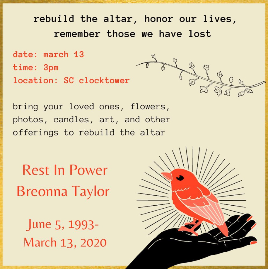 Please join Santa Cruz community members this Saturday, March 13th at 3pm to rebuild the altar at the downtown clocktower. March 13th will mark one year since Breonna Taylor was murdered by the police state. Bring your loved ones, and also offerings such as flowers, artwork, candles, photos, etc. Please wear masks and practice physical distancing.
