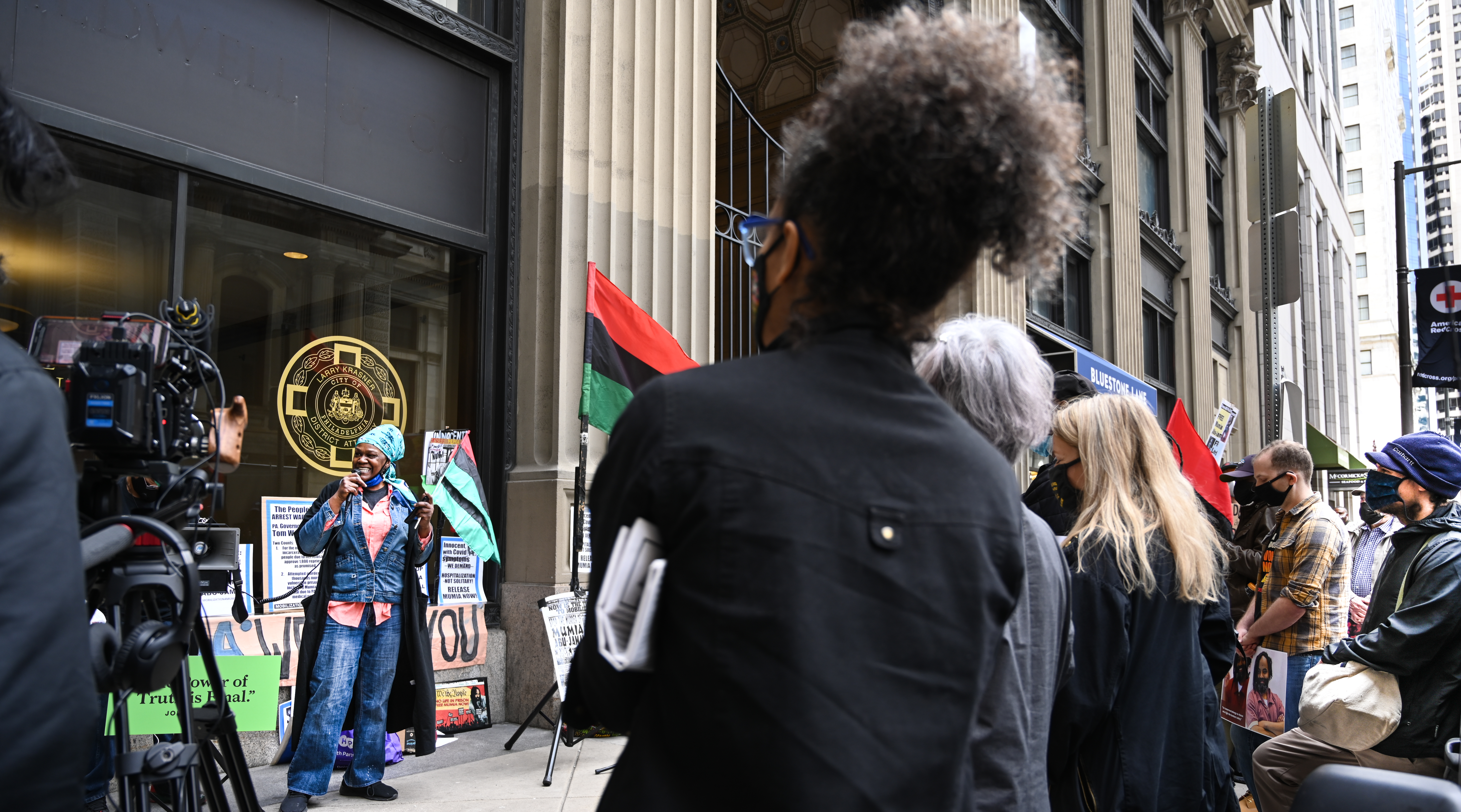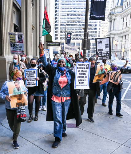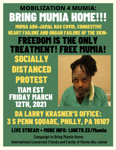 Photos of the March 12, 2021 protest for Mumia Abu-Jamal outside of Philadelphia District Attorney Larry Krasner's Office. Photos by Jamal Journal staff photographer Joe Piette.