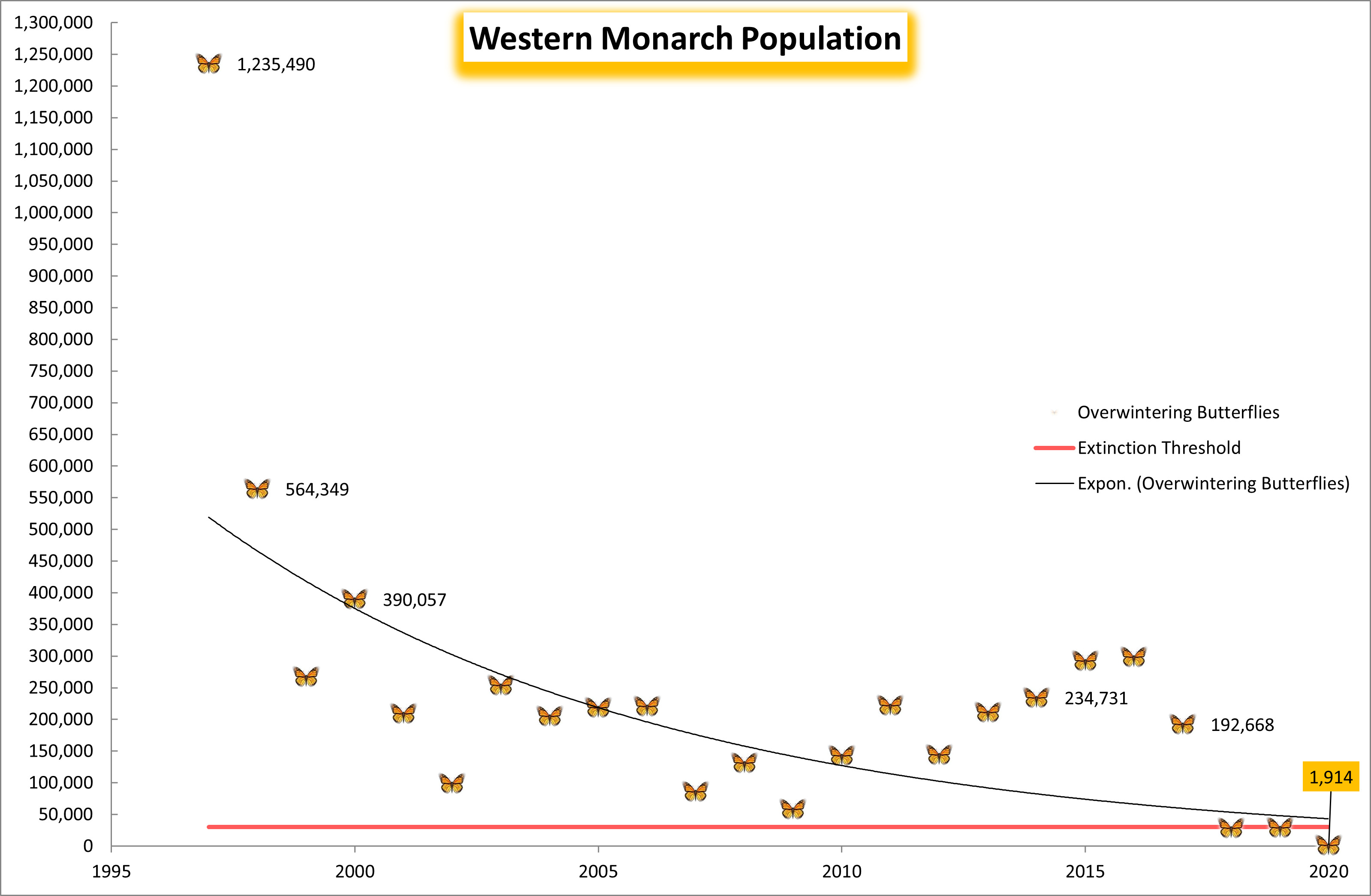 This monarch population is found primarily in Arizona, California, Idaho, Nevada, Oregon, Utah and Washington, and overwinters on the coast of California. This past winter, only 1,914 monarchs were recorded overwintering on the California coast — the lowest number ever recorded.