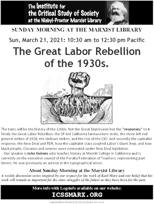 The topic will be the history of the 1930s. Not the Great Depression but the *responses* to it. Firstly the Great Labor Rebellion: the CP-led California farmworkers strike, the three left-led general strikes of 1934, the sitdown strikes, and the rise of the CIO. And secondly the capitalist response, the New Deal and FDR, how the capitalist class coopted Labor’s Giant Step, and how black people, Chicanos and women were mistreated under New Deal legislation.