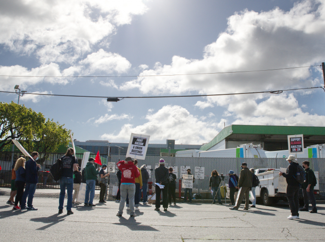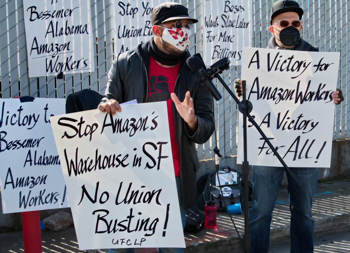 Union activists gathered at the South San Francisco site of Amazon's purchase of an entire block intended for a new warehouse.They protested Amazon's treatment of its workers, demanded that the space be used instead for affordable housing, and above all, they were there in support of the Amazon workers in Bessemer, Alabama who are struggling to become Amazon's first unionized U,S, workers.