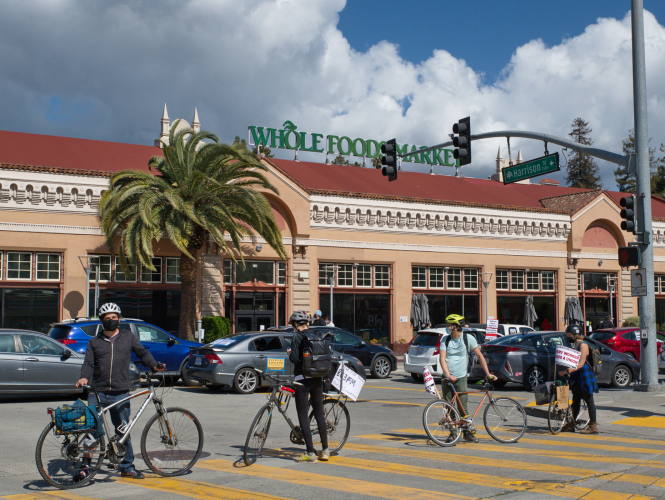 The caravan paused in front of Amazon's Whole Food Market for a frank delivery of its views regarding the unionization struggle of Amazon's Bessemer, Alabama workers.. They created a monumental traffic jam..