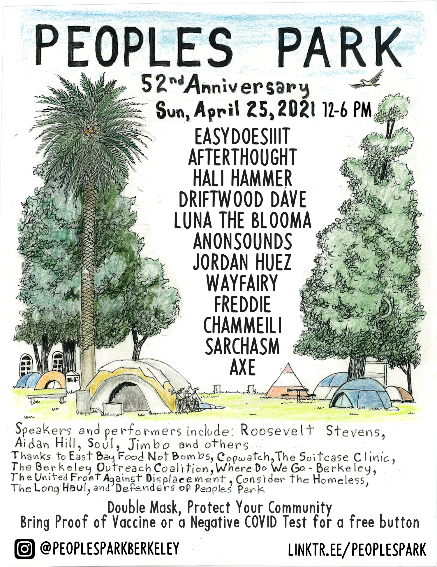Bring proof of vaccine or negative COVID test for a free button! See @peoplesparkberkeley on Instagram for more details.