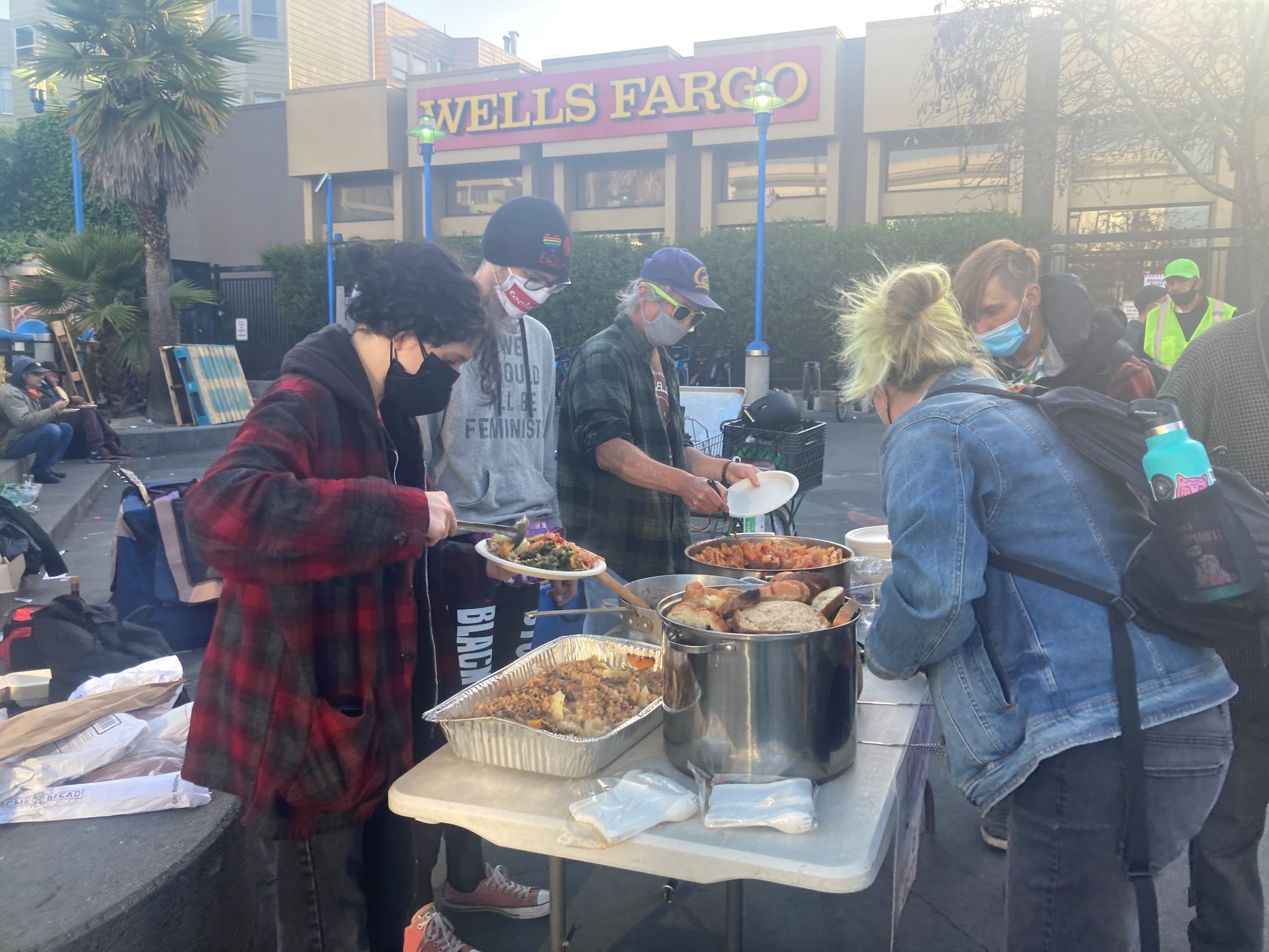 San Francisco Food Not Bombs' weekly Wednesday Mission District sharing has resumed its regular format after switching to mobile food distribution at the beginning of the COVID-19 crisis.