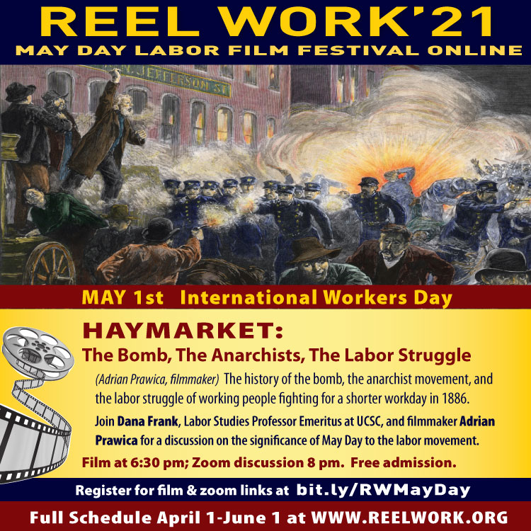 The California premiere of “Haymarket: The Bomb, the Anarchists, the Labor Struggle” will be shown one time at 6:30 pm, May 1, followed by panel discussion with the film maker at 8pm. In this feature documentary, expert historians and professors present the history of the bomb, the anarchist movement of the 19th century, and the labor struggle of working people fighting for a shorter workday during the industrial might of America's Gilded Age.