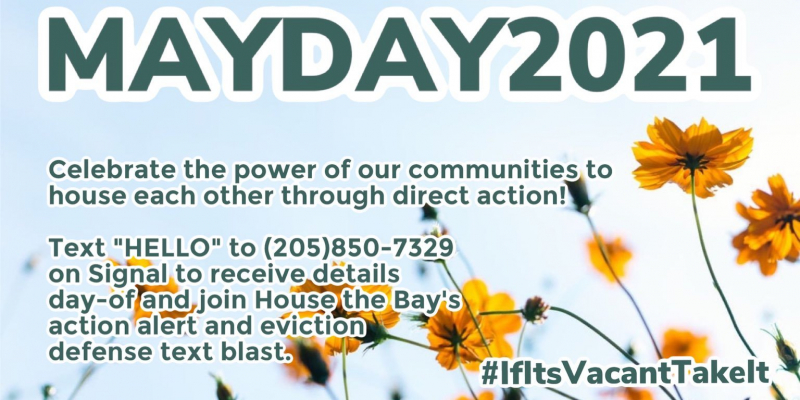 MAY DAY 2021: Celebrate the power of our communities to house each other through direct action! Text HELLO to (205) 850-7329 on Signal to receive details and join #HousetheBay action alert and eviction defense blast. Actual time not public yet.