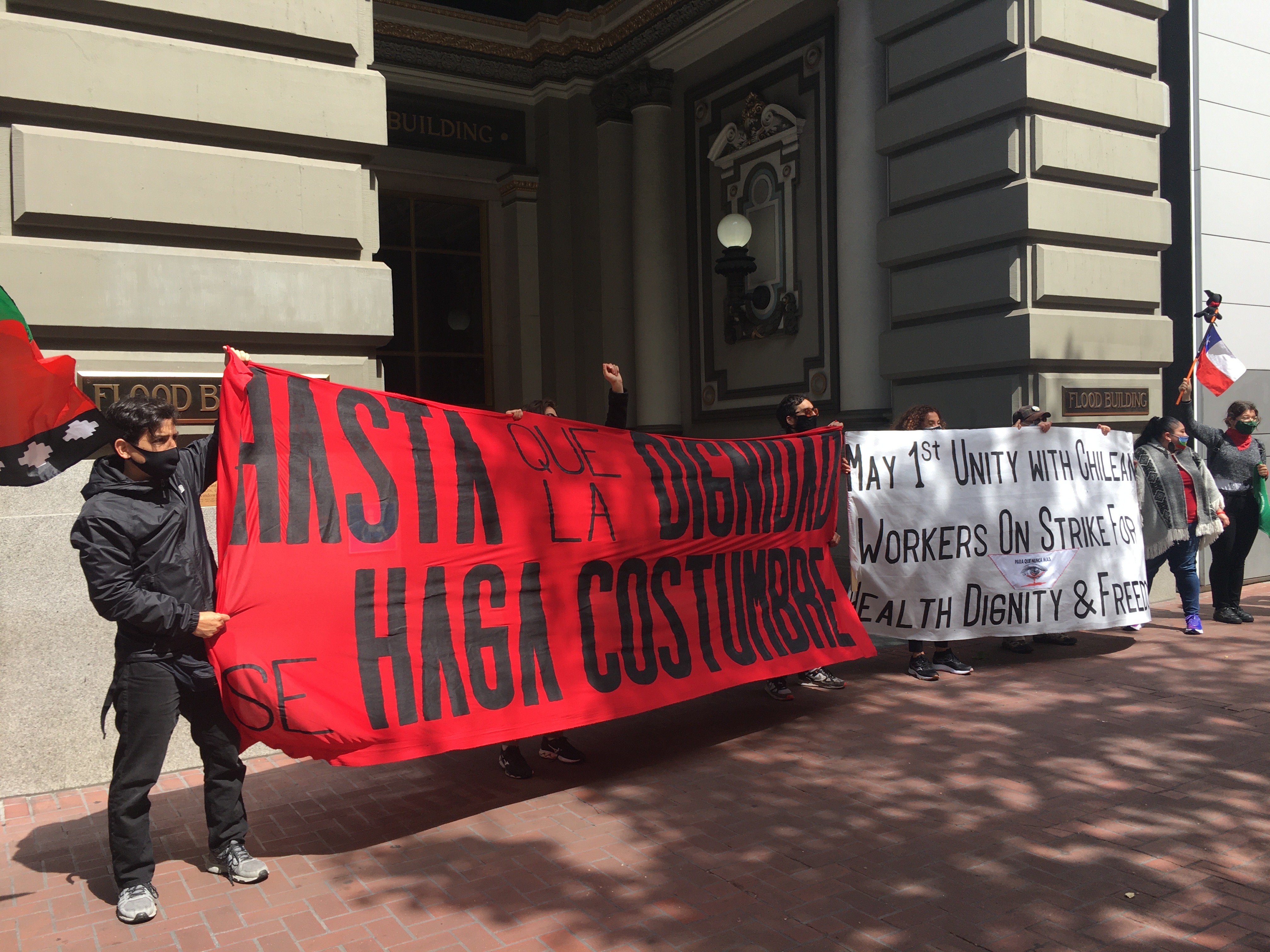On May 1, 2021 in San Francisco, ILWU longshoremen rallied at the Chilean consulate in San Francisco to show their solidarity with the Chilean dockworkers union who went on strike against the attacks by the reactionary Chilean government.