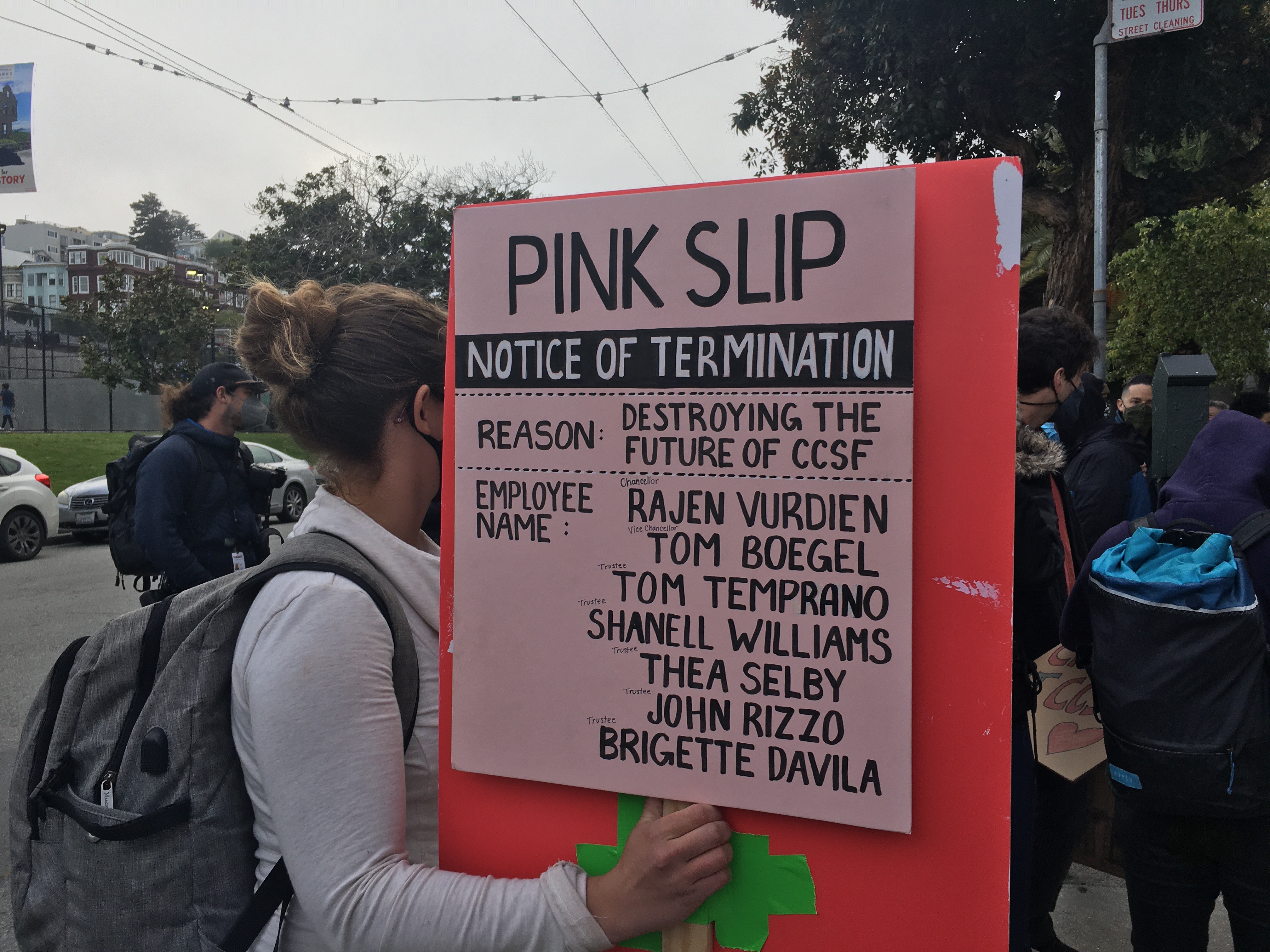 CCSF students and supporters rallied at Mission High on May 6, 2021 and marched through the Castro district to Trustee Tom Temprano's houseto demand that he vote against the cutbacks of 160 faculty positions. Temprano and CCSF Board of Trustees president Shanel Williams have approved massive cuts of faculty and the shutdown of campuses including Fort Mason. They also are using unions busting tactics to demand concession bargaining by the union AFT 2121.