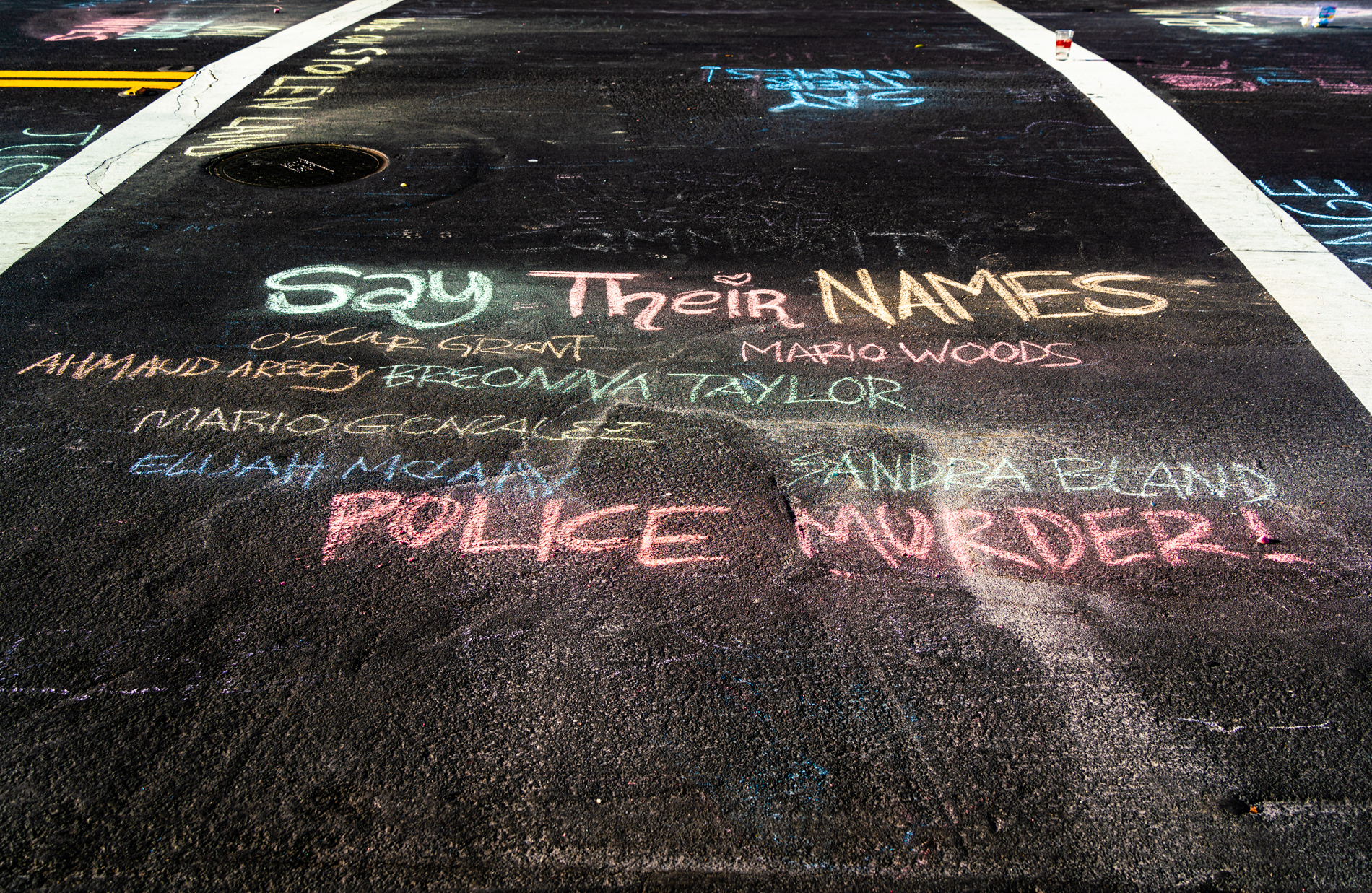 On May 7, a small group in San Rafael protested the killing of Mario Gonzalez by police. Attendees listened to a speech given by George Galvis of curyj.org. Demonstrators chalked messages in remembrance of Gonzalez and other victims of police brutality.