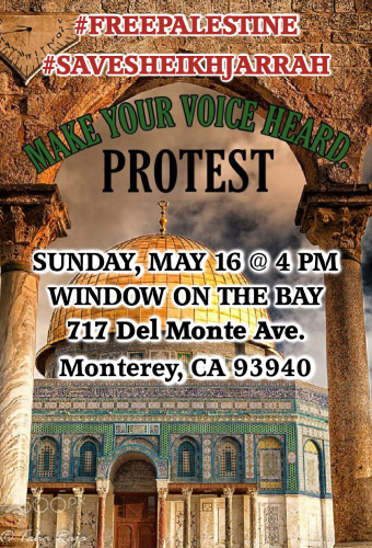 Stand in Solidarity with PALESTINE! Peaceful PROTEST Sunday, May 16 at 4:00 PM, Window on the Bay, 717 Del Monte Ave., Monterey, CA. #SaveSheikhJarrah #FreePalestine