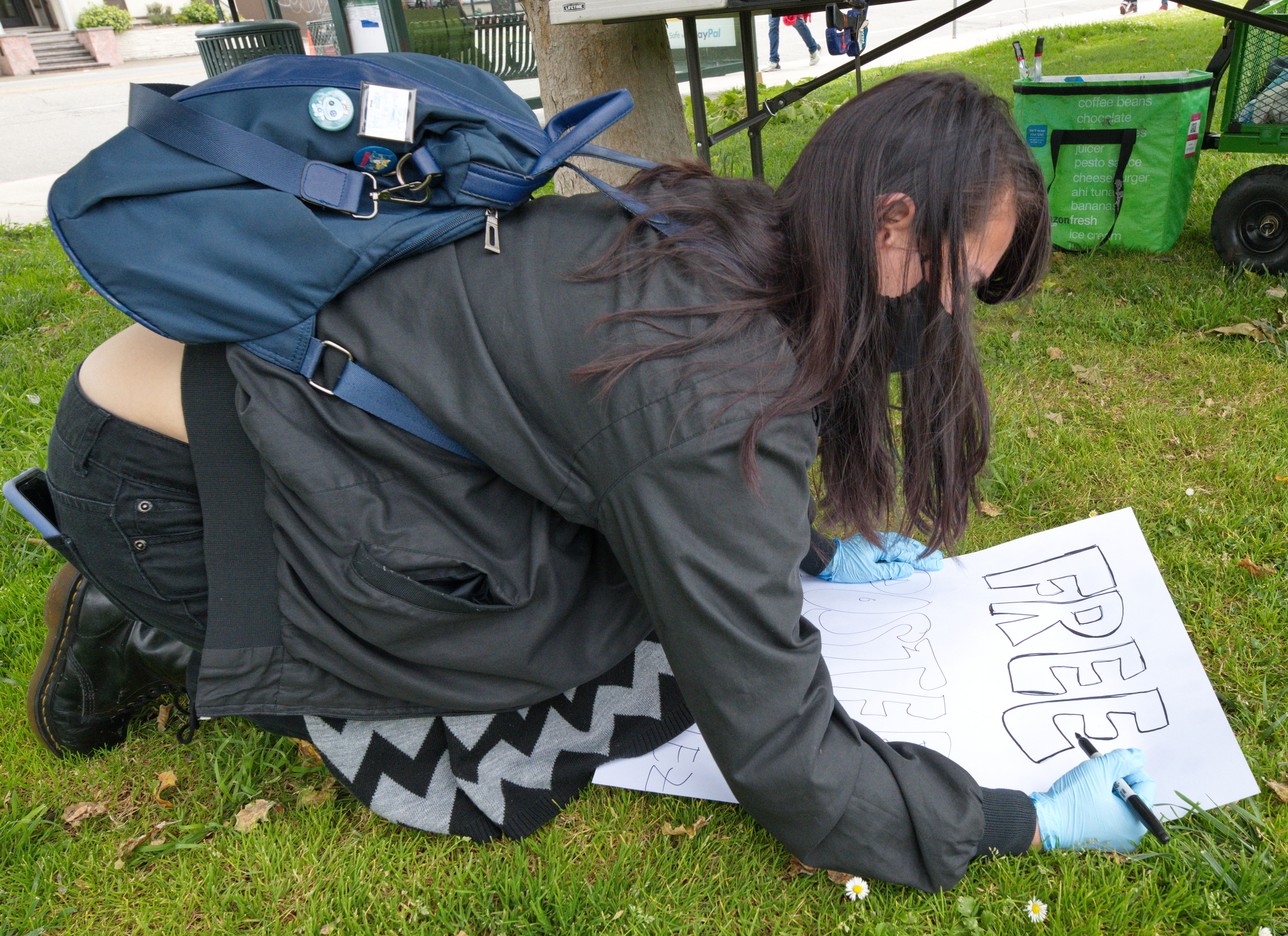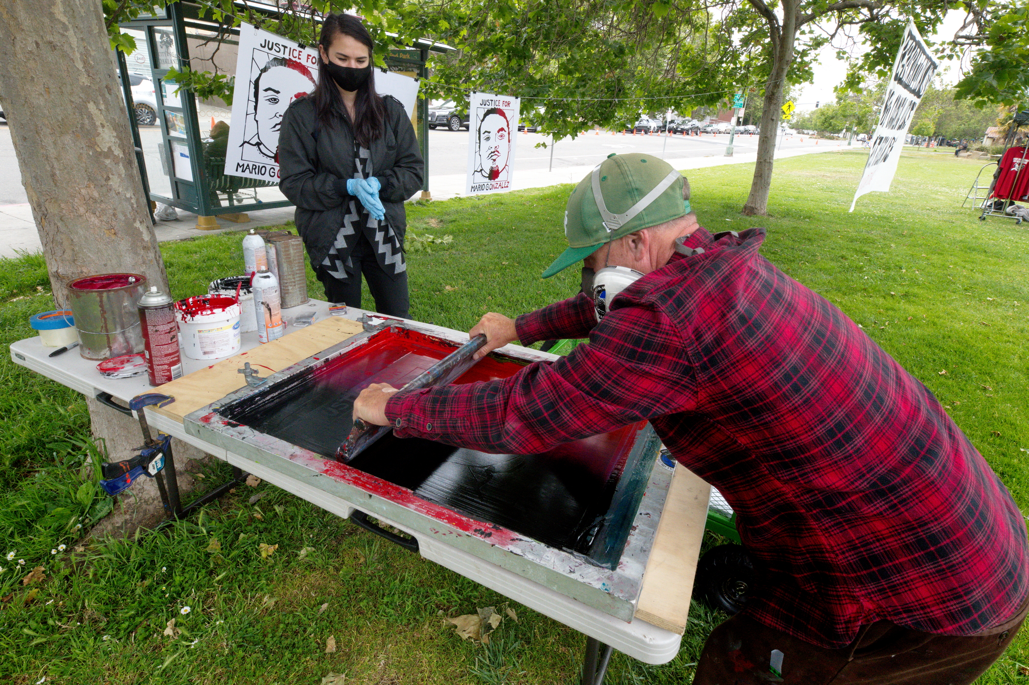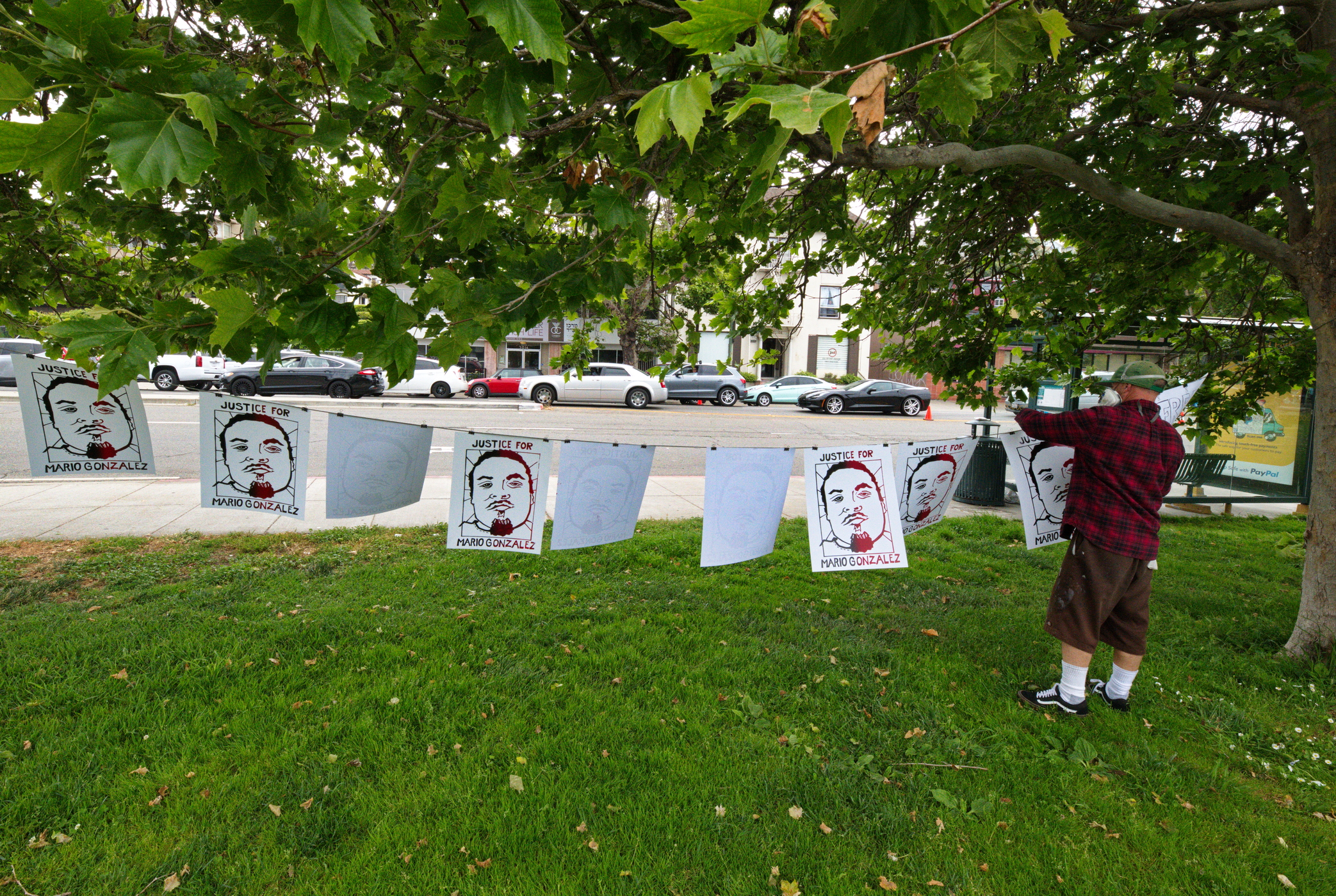 On a line strung between two trees, a line of silk screen prints of a "Demanding Justice for Mario Gonzales" poster was created and displayed. Gonzales was among the many killed by police.