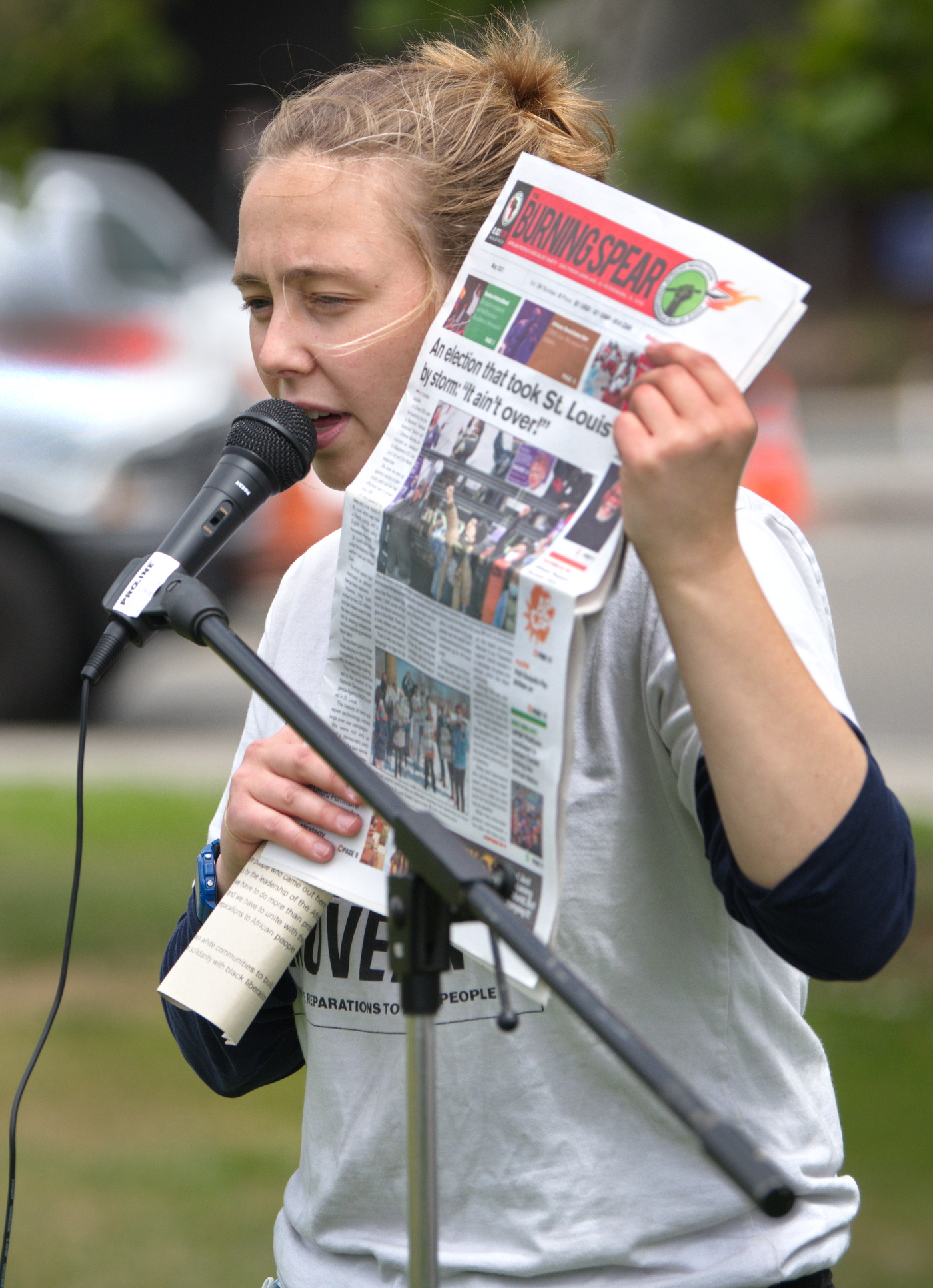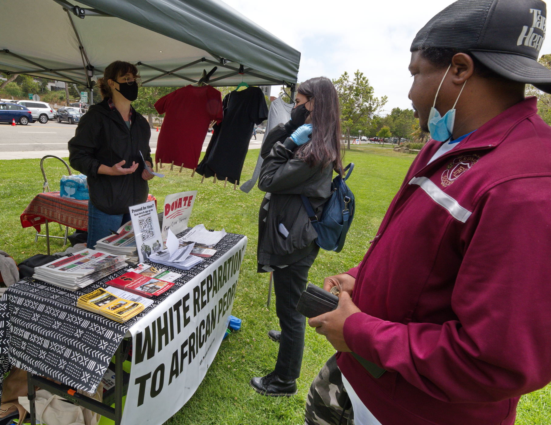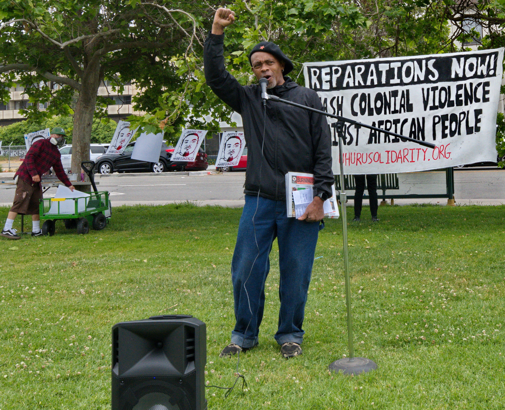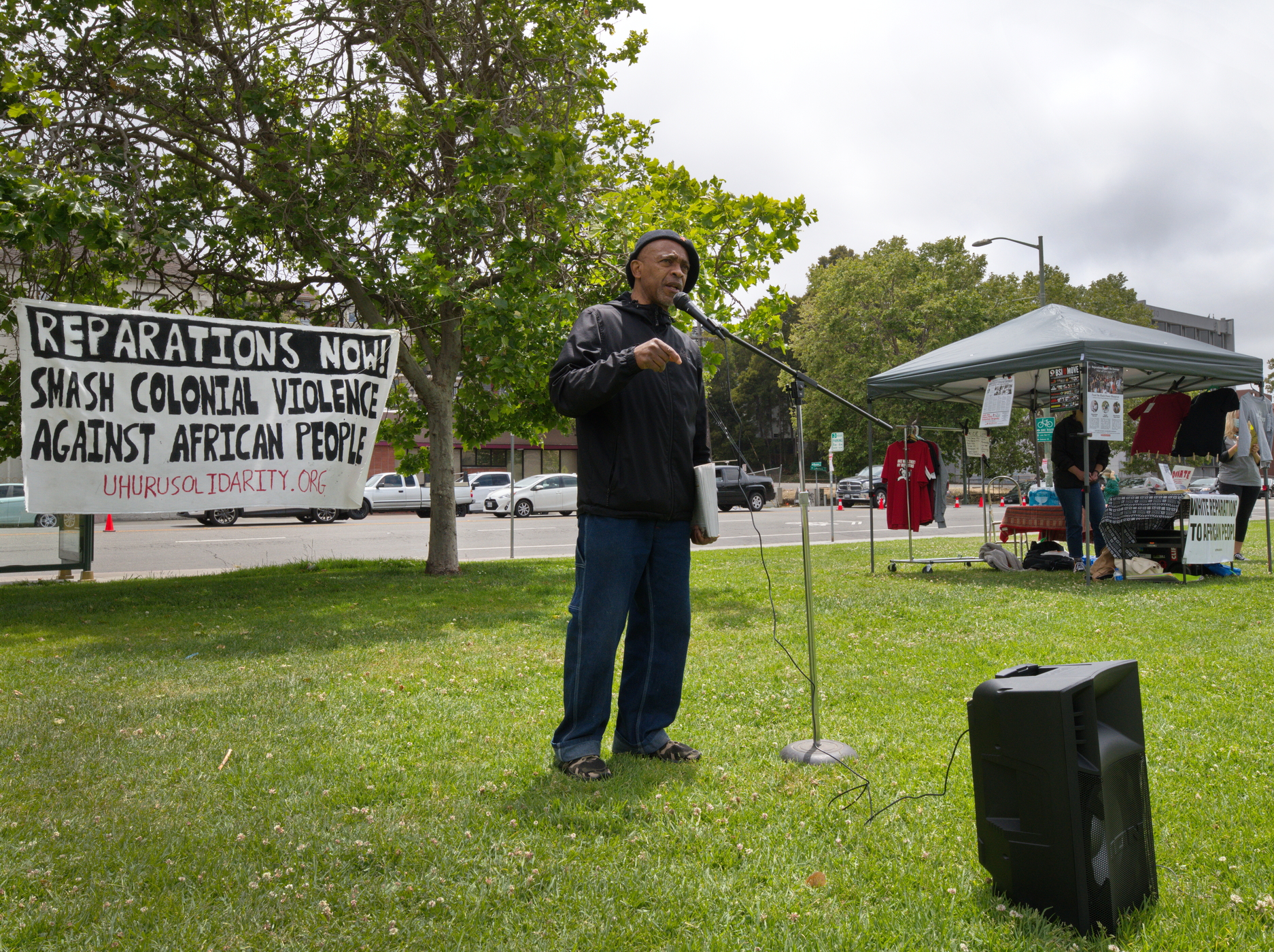 The Uhuru Solidarity Movement, is an organization under the leadership of the African People’s Socialist Party, with the responsibility to organize in the white community to raise reparations. The USM Oakland branch called on white people who want to take a stand against the ongoing police terror and colonial violence happening against the black community to come out to this teach-in and rally take a stand against the genocide happening in our name.