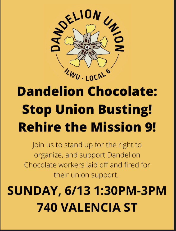 ILWU Local 6 San Francisco Dandelion chocolate workers and their supporters rallied at the Dandelion Mission store on 740 Valencia St. to call for the rehiring of 9 pro-union workers who they said were terminated because of their support of the union drive.