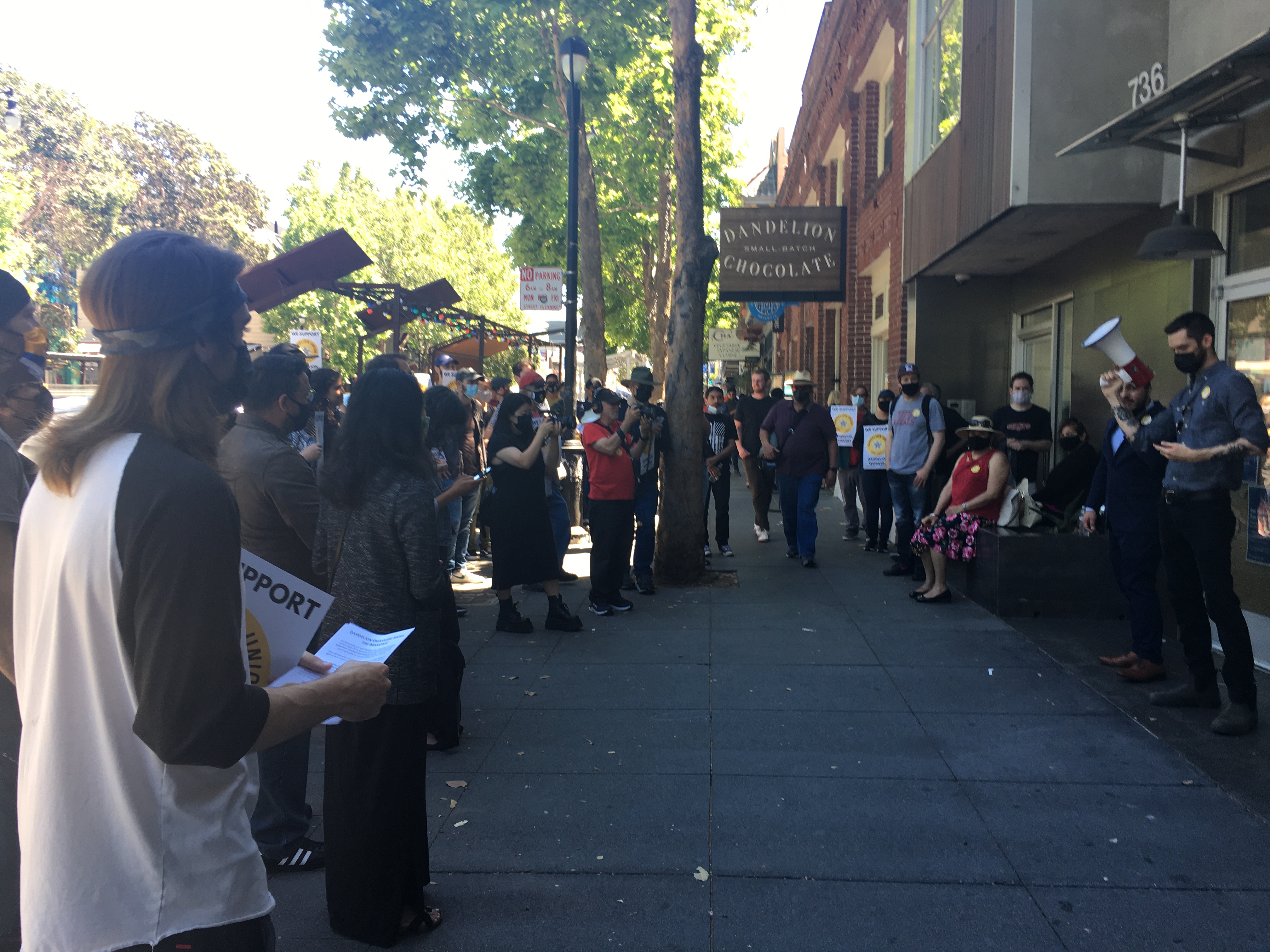ILWU Local 6 Dandelion chocolate workers and supporters rallied and spoke out at the Mission Dandelion store to demand the rehiring of the fired workers.