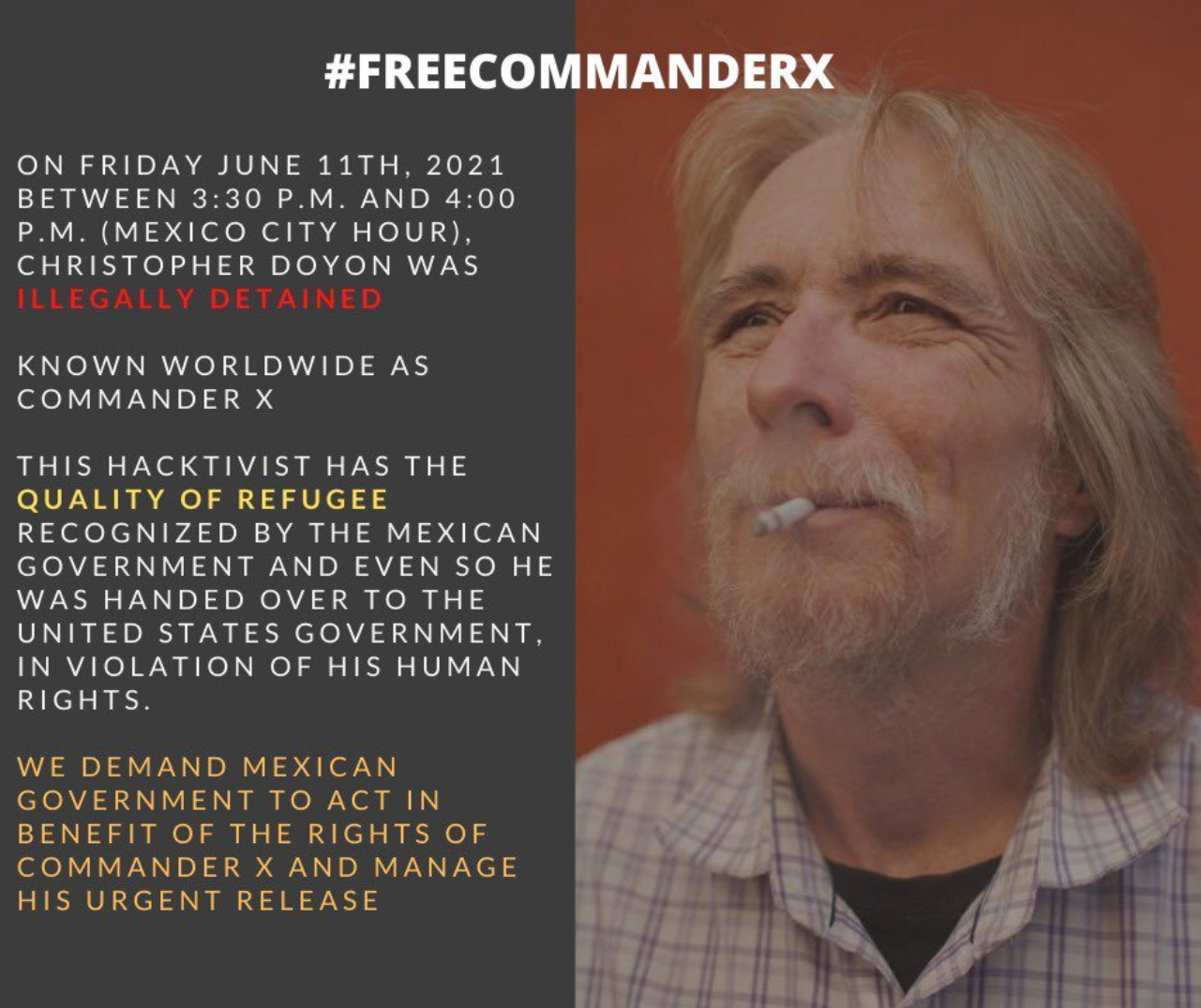 On Friday June 11th, 2021 between 3:30 P.M. and 4:00 P.M. (Mexico City hours), Christopher Doyon was illegally detained. Known Worldwide as Commander X, this Hactivist has the quality of refugee recognized by the Mexican government, and even so he was handed over to the United States government, in violation of his human rights. We demand the Mexican government to act in benefit of the rights of Commander X and manage his urgent release.