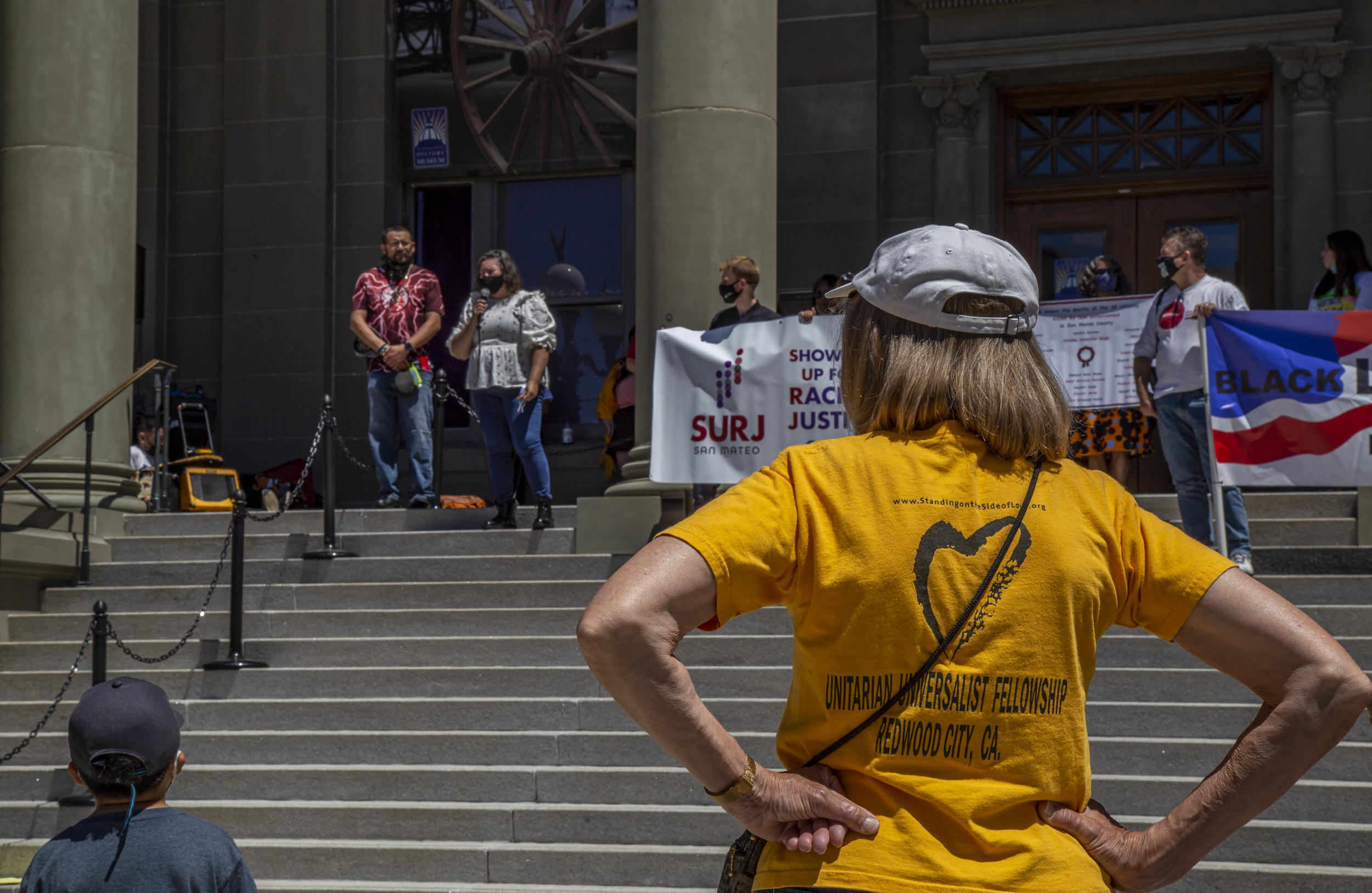 Organizations hosting the protest were the San Mateo County Law Enforcement Accountability Coalition and Coalition Z. Co-sponsors included Reach Coalition, SURJ San Mateo, Peninsula Young Democrats, and the Raging Grannies Action League.