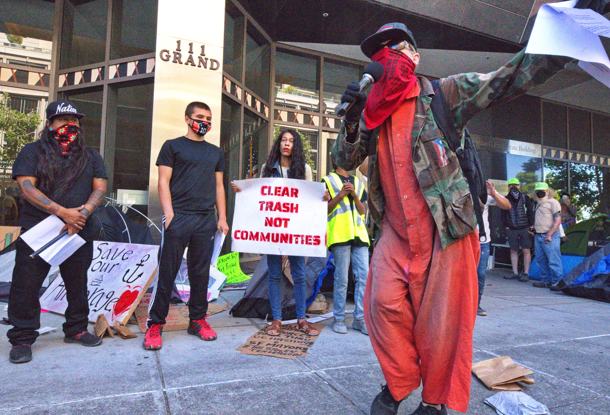 Activists called on state, local, city, county officials and the public health department to protect our unhoused communities, to SUPPORT and STOP THE SWEEPS! Local health officers may take any measures to ensure the safety and protection of public health - sweeps and displacement are a CRISIS. See Section 8558 of the Government Code.