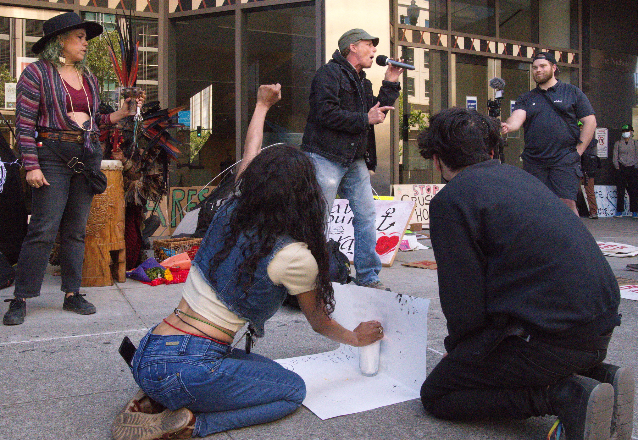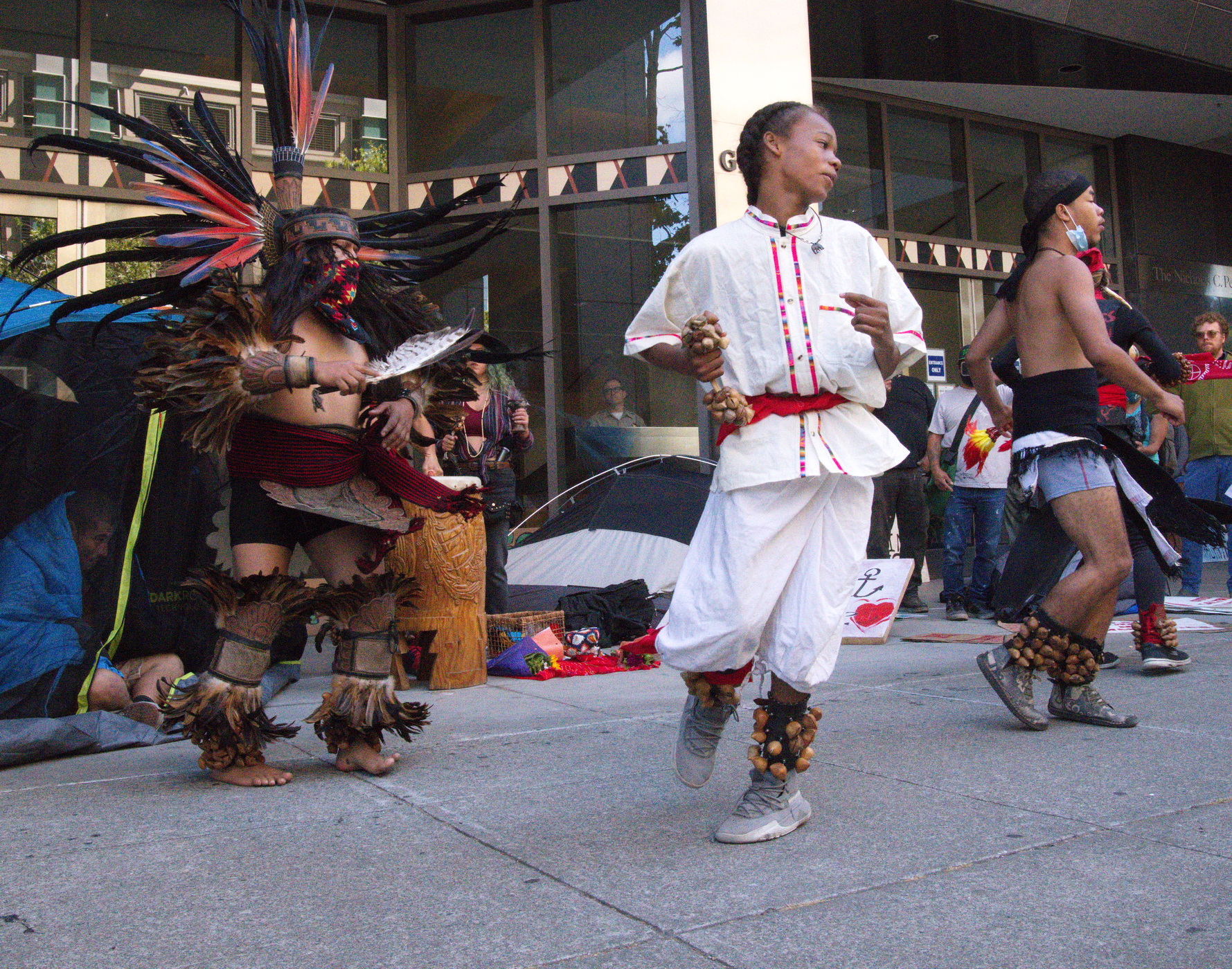 Street theater, song and dance in protest in Oakland at 111 Grand Ave.