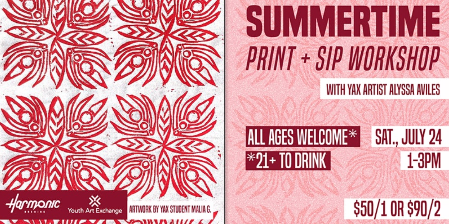 Celebrate summer with our first in-person Print & Sip workshop, hosted by Youth Art Exchange printmaker Alyssa Aviles and Harmonic Brewing. Create your own block print to make prints and cards with your very own design, while enjoying some delicious locally brewed beers!