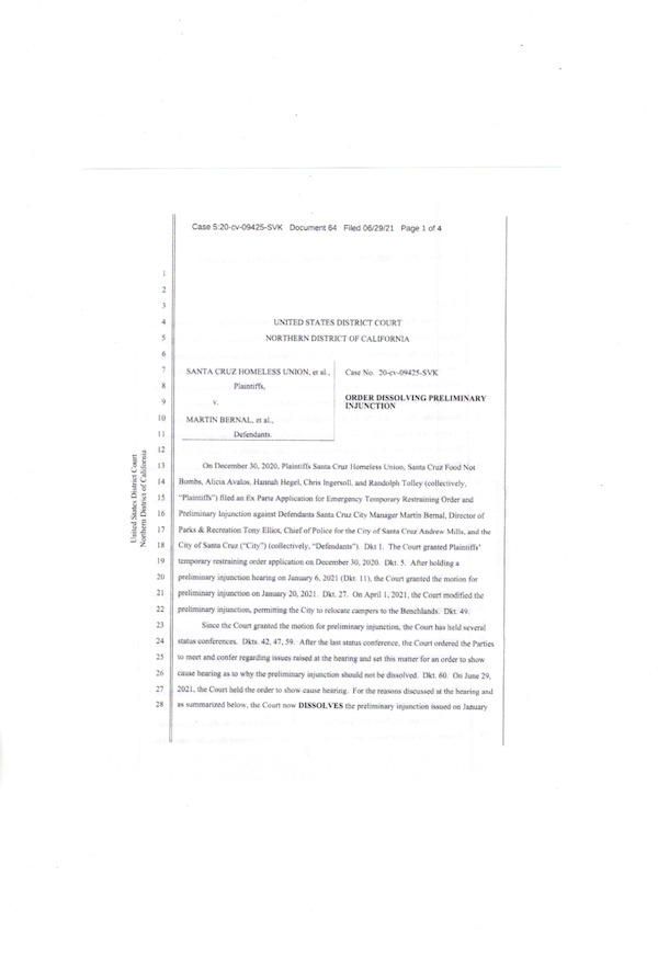 The federal court ignored the City Manager Bernal's failure to fulfill the terms of the modified Preliminary Injunction to meet regularly with the Homeless Union to improve Benchlands conditions. Magistrate Susan Van Keulen lifted the Court's protection of the encampment Tuesday afternoon, discarding more than several hundred people into the City's predatory "care".