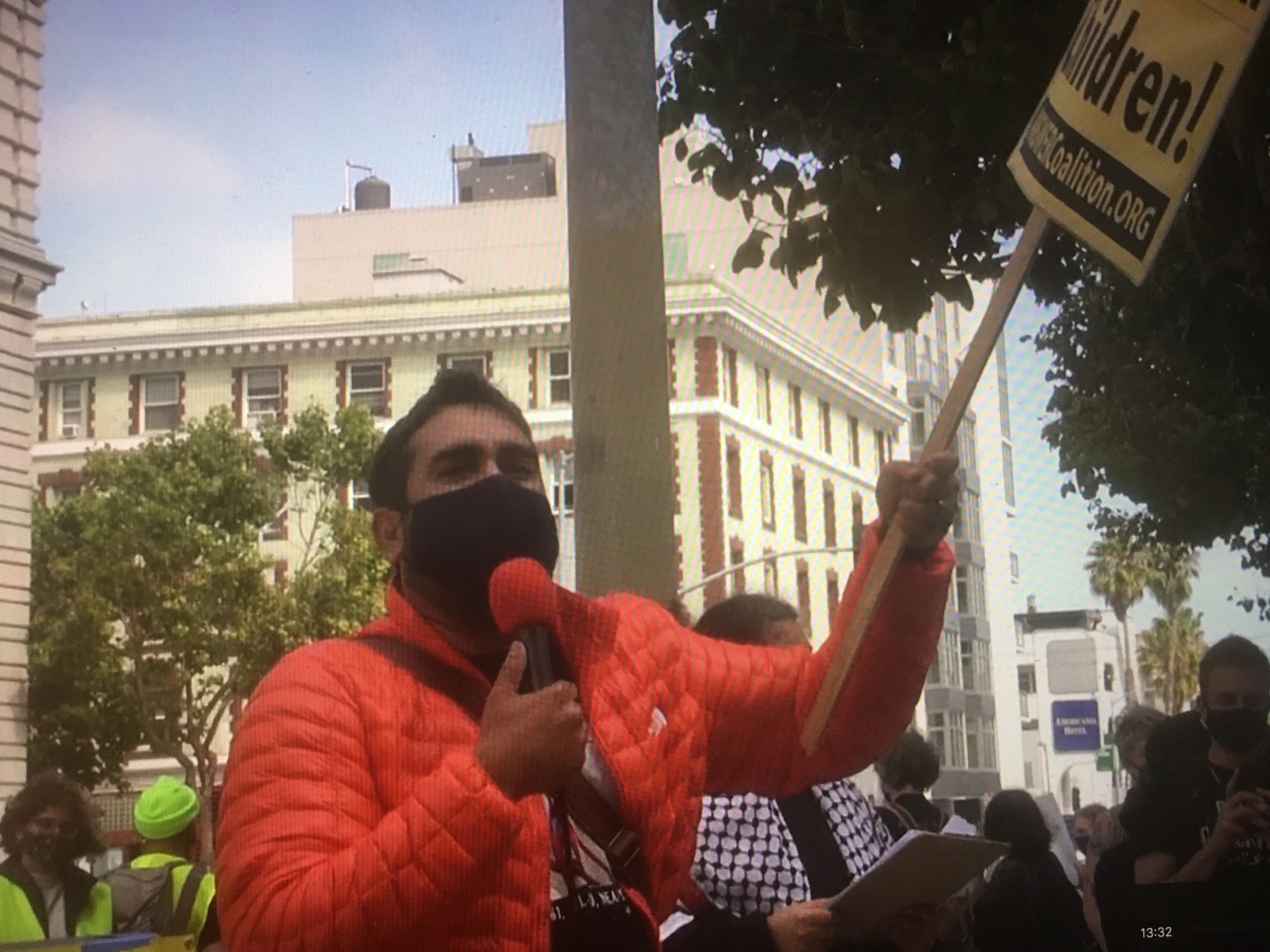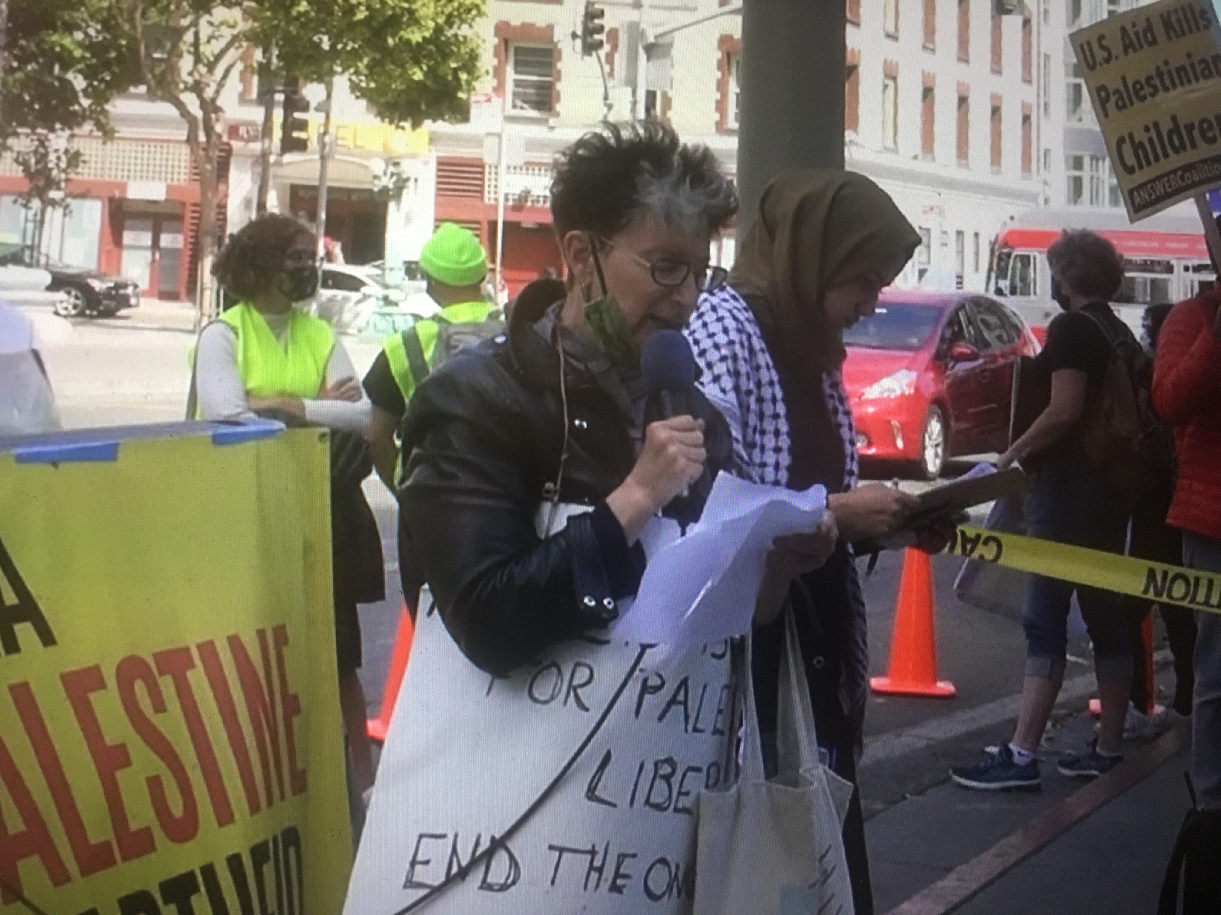 A protest was held on at Congressional leader Nancy Pelosi's office in San Francisco on July 2, 2021 to protest her support of military aid to Israel. Speakers including unionists talked about the need to oppose the attacks on Palestinians and evictions from their housing.