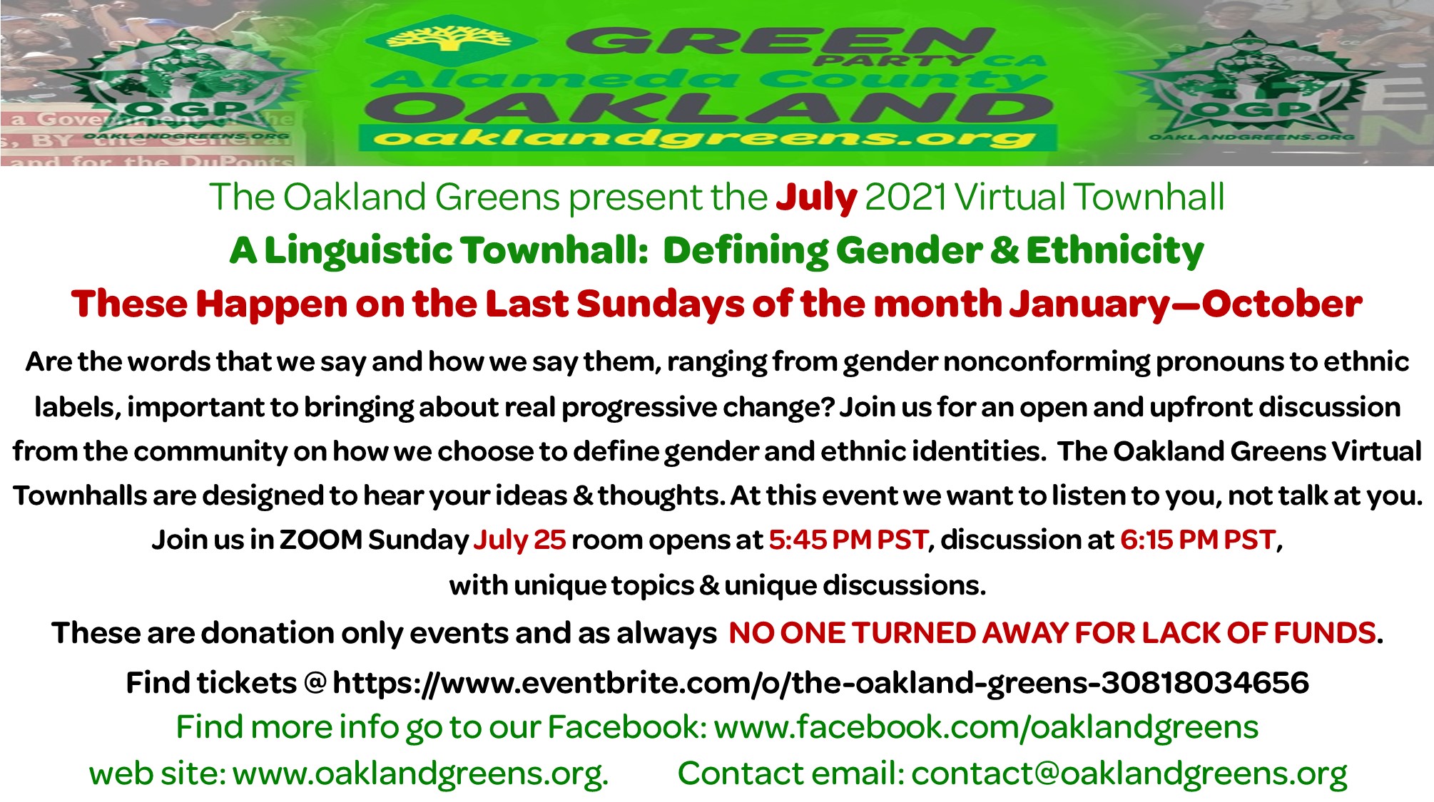 labels, important to bringing about real progressive change? Join us for an open and upfront discussion from the community on how we choose to define gender and ethnic identities. The Oakland Greens Virtual Townhalls are designed to hear your ideas & thoughts. At this event we want to listen to you, not talk at you. Join us in ZOOM Sunday July 25 room opens at 5:45 PM PST, discussion at 6:15 PM PST,