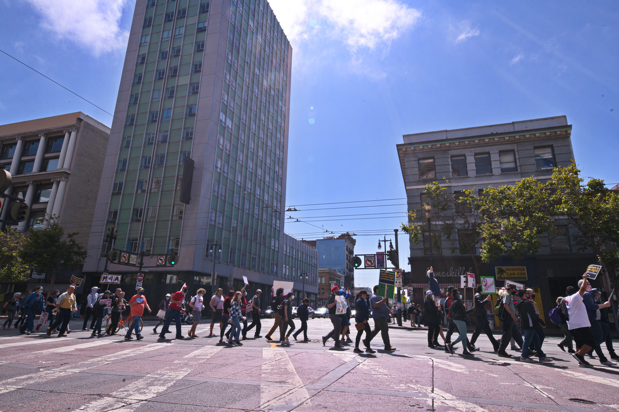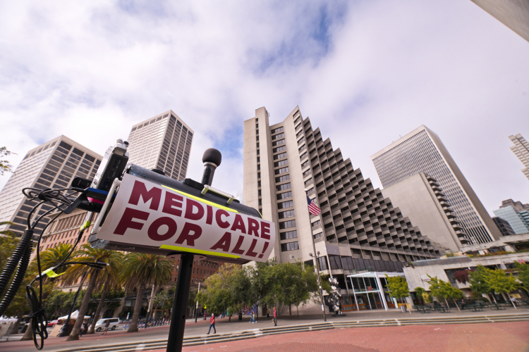 The march began at Justin Herman Plaza at San Francisco's Embarcadero.A skit was performed illustrating the vast sums the US spends on warfare and could easily be redirected to healthcare for all.