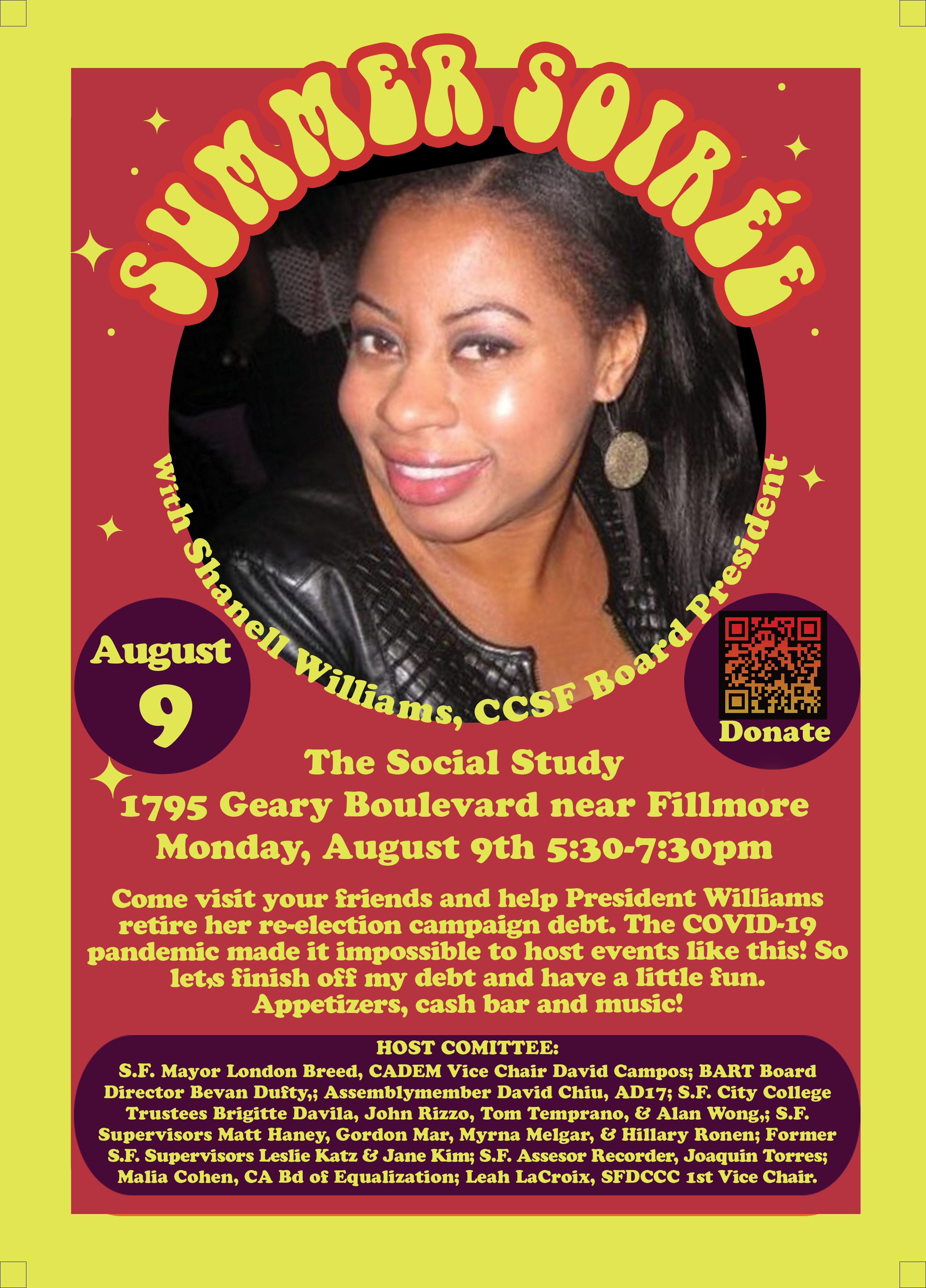Host Committee: Mayor London Breed; Treasurer Fiona Ma; Assemblyman David Chiu; Assemblyman Phil Ting; Board of Equalization Member Malia Cohen; California Democratic Party Vice Chair David Campos; San Francisco Assessor Recorder Joaquin Torres; BART Board Director Bevan Dufty and Lateefah Simon; City College Trustees Tom Temprano, Brigitte Davila, John Rizzo, Thea Selby and Allan Wong; San Francisco Board of Supervisors Myrna Melgar, Matt Haney, Hillary Ronen, Gordon Mar; San Francisco Democratic Party First Vice Chair Leah Lecroix; Former San Francisco Supervisors Jane Kim and Leslie Katz.