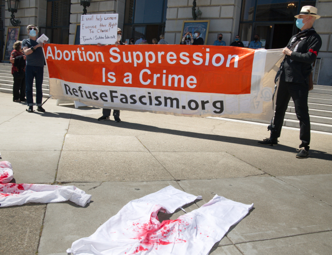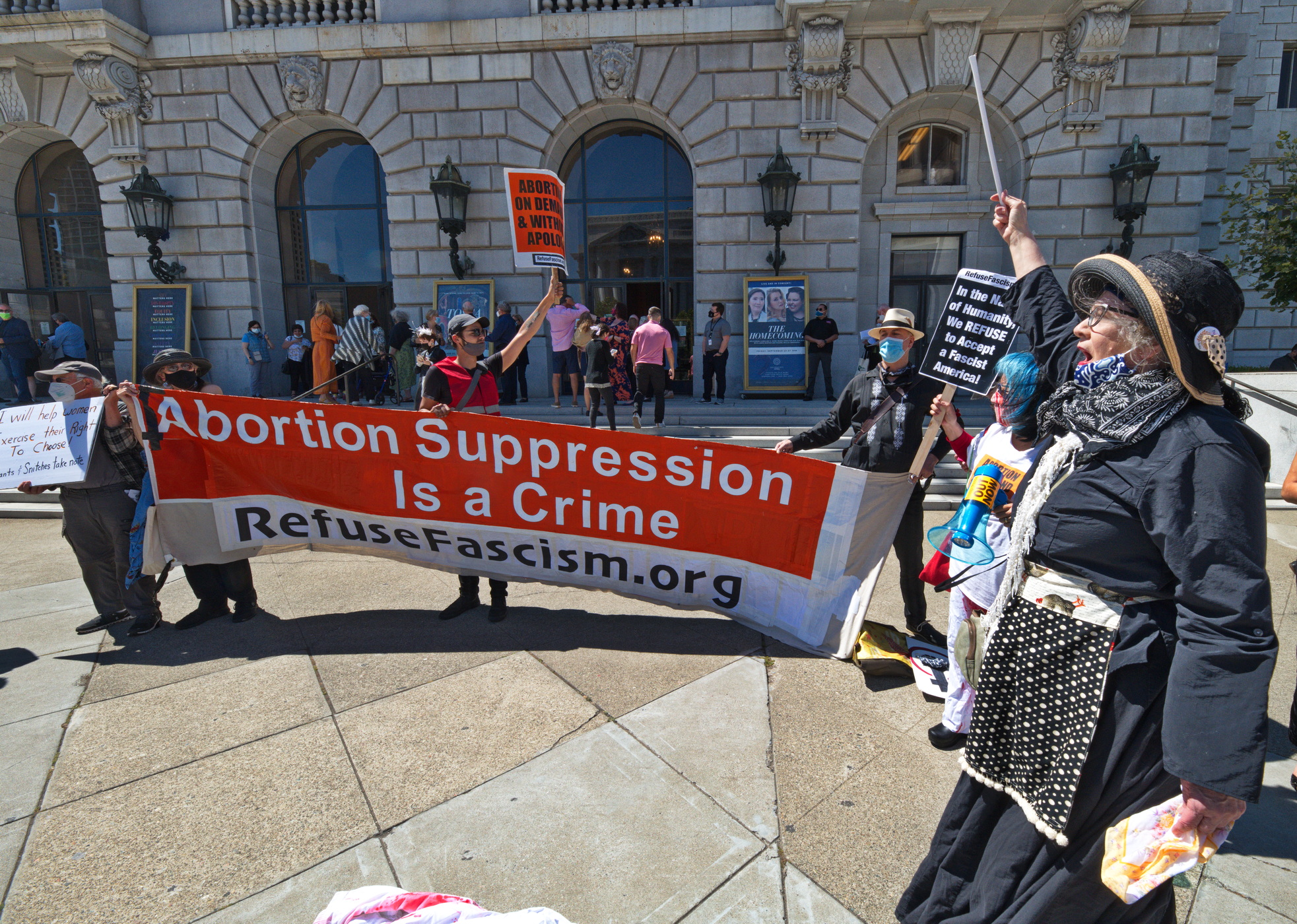 In addition to a performance of the opera Tosca, opera goers saw some street theater in front of San Francisco's War Memorial Opera House.On Sunday, activists displayed "bloody" pants and mourned over "dead" women to illustrate the expected results of Texas's extreme anti abortion law just passed. Granny Ruth was in fine form as she led chants and "cried" over anticipated bloodied "victims" of attempted self abortions.