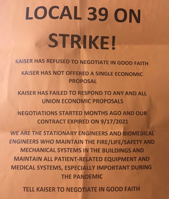 Striking San Francisco IUOE Local 39 stationary engineers spoke out on September 18, 2021 about their issues on the first day of their strike. Seven hundred engineers in Northern California are on strike and Kaiser is trying to bring in chief engineers from Southern California.
