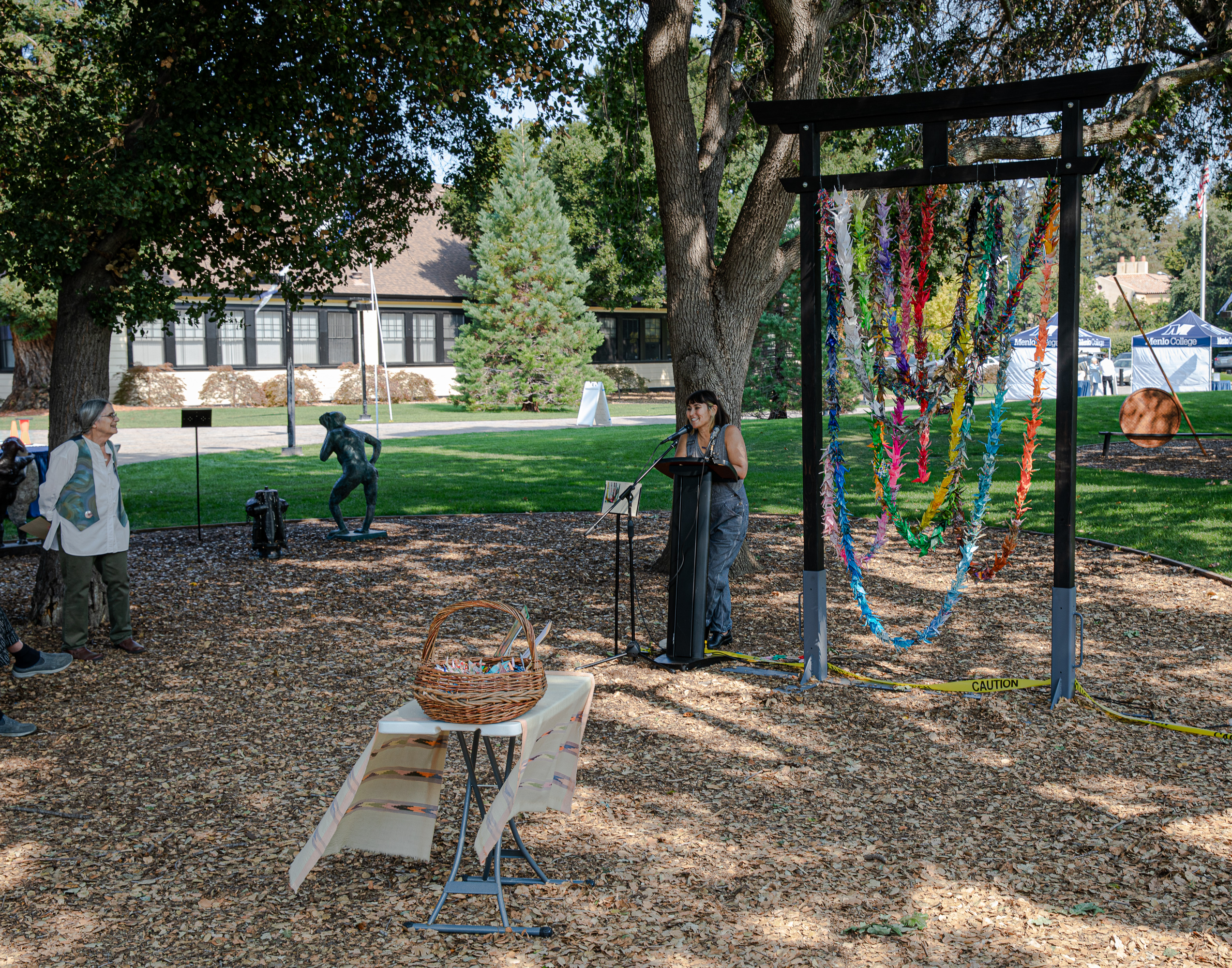 Artist Lisa Solomon draws inspiration from the Japanese Shinto tradition, a religion that includes ancestor reverence and a belief in sacred power in both animate and inanimate things. Her sculpture "The Peace Gate" combines a redwood Shinto torii gate, constructed for her by artisan Jim Gilardi, with an arrangement of strands of origami peace cranes.