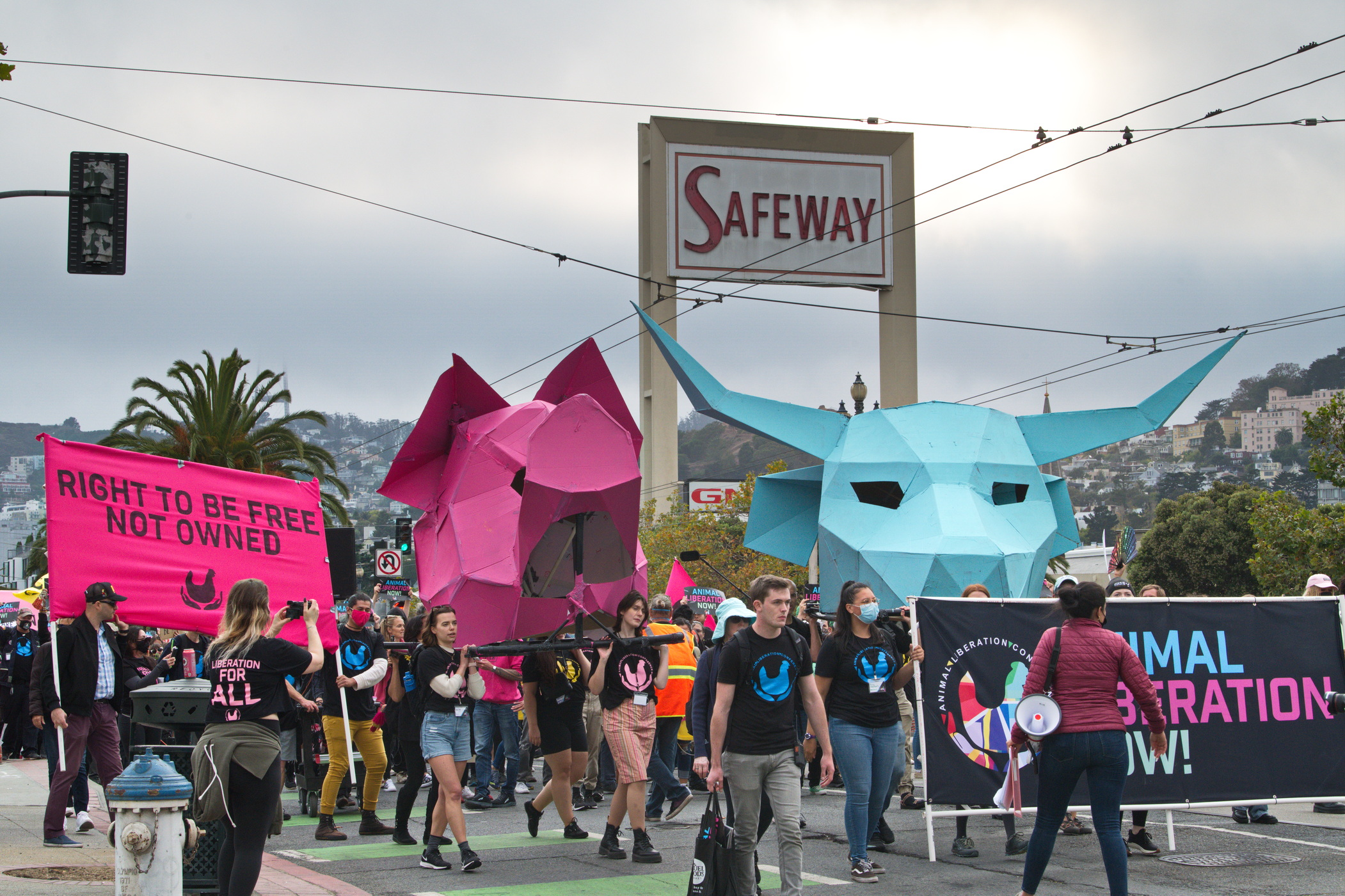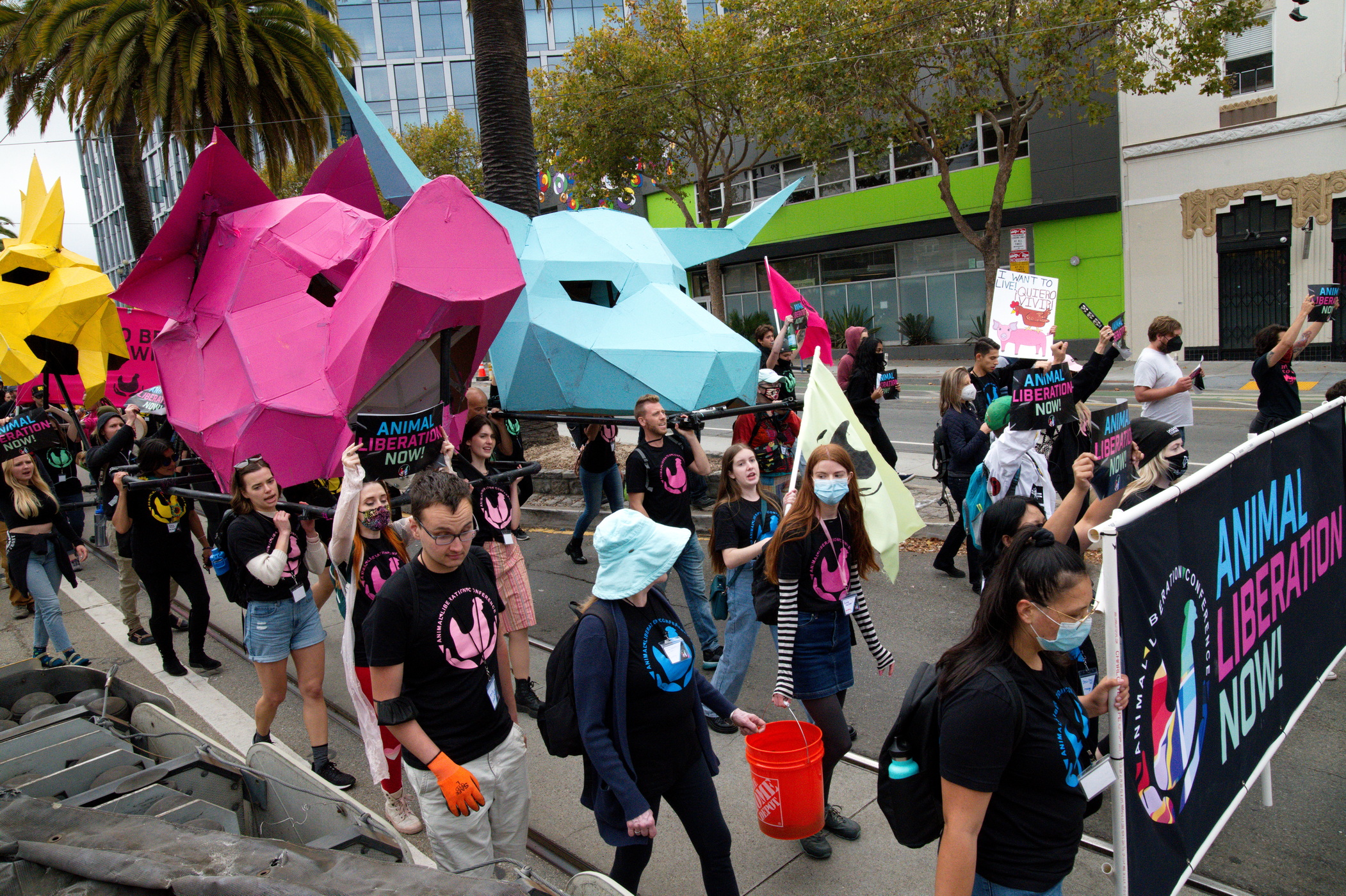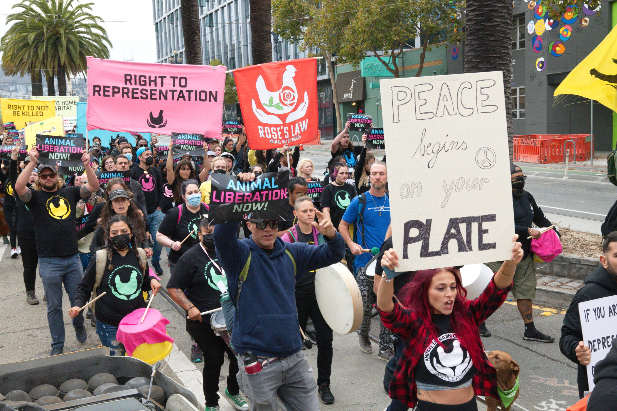From Dolores Park to City Hall with a die-in at Whole Foods, a march organized by DxE, Direct Action Everywhere