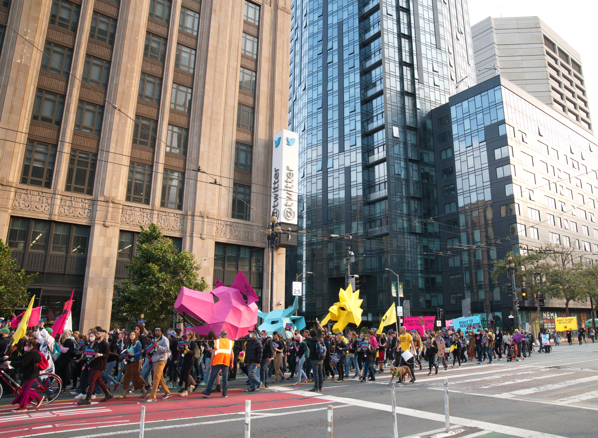 The march was interrupted by a fire on Valencia Street with huge fire engines temporarily scattering everyone. The fire was dealt with (no apparent injuries) and the march regrouped and resumed.