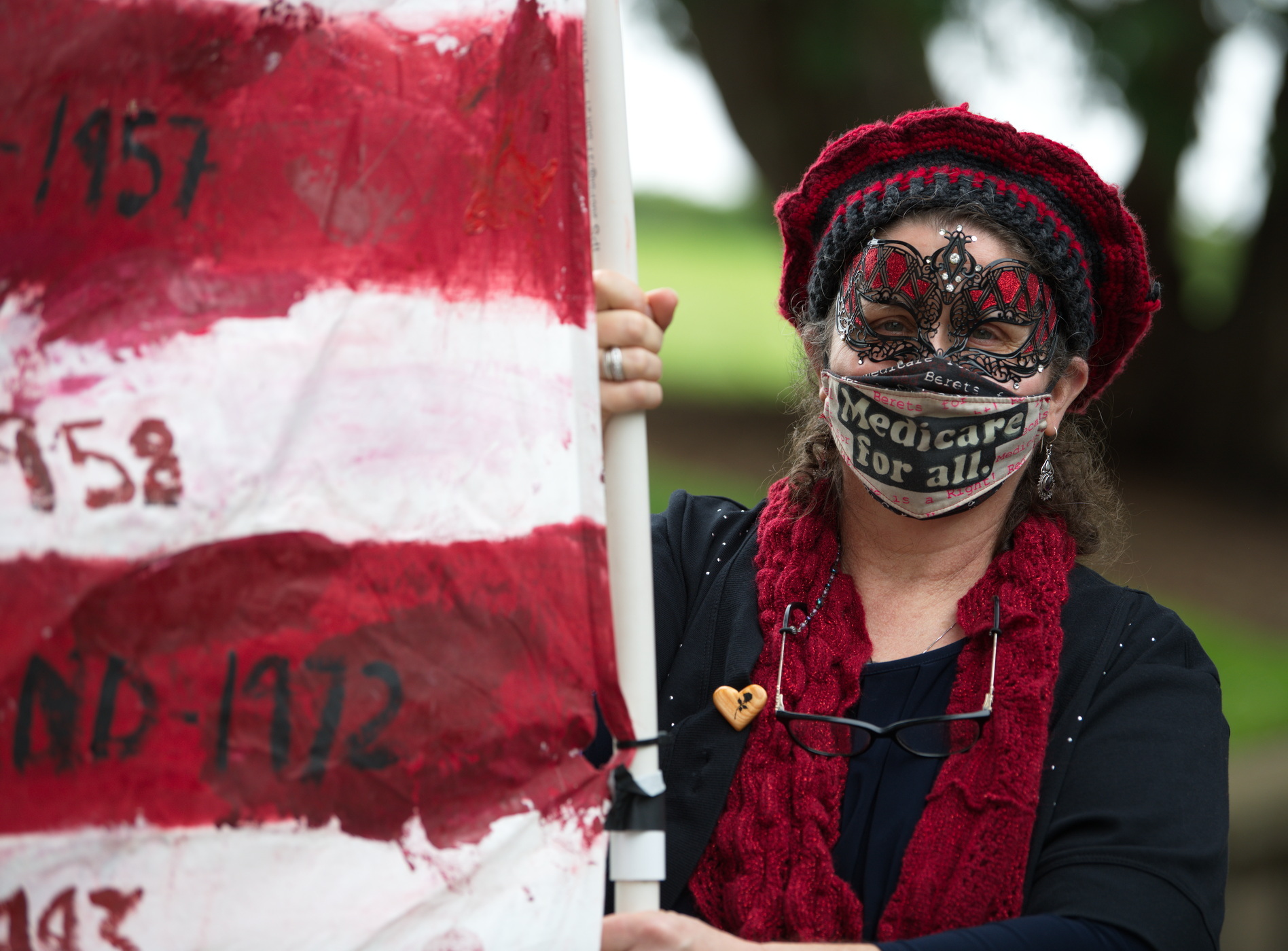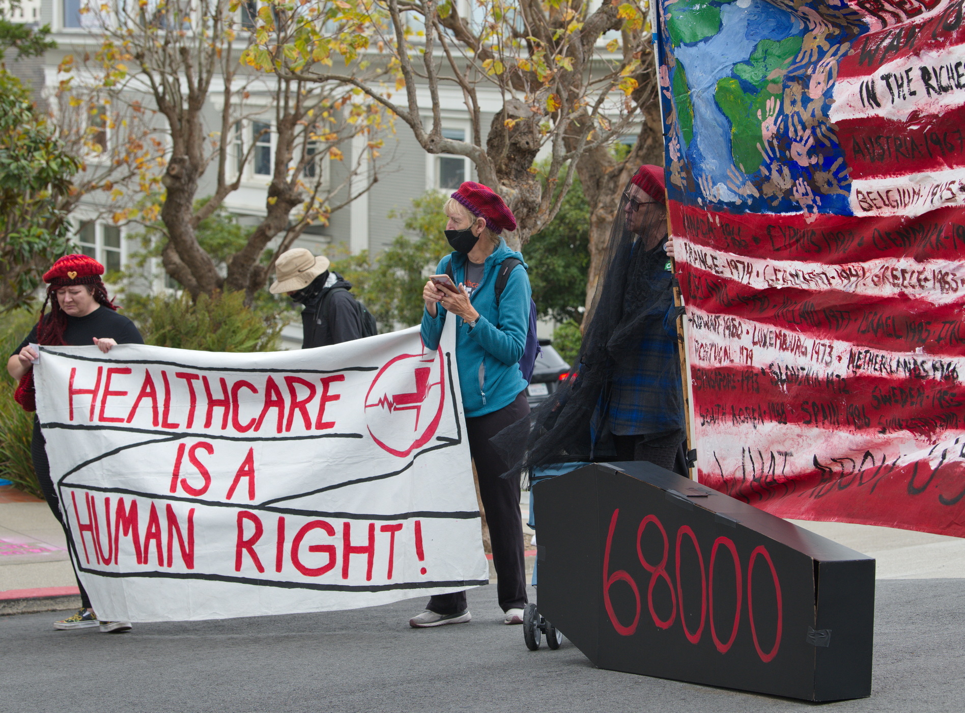 The coffin they carried was fake, but the "68000" painted on it, the number of deaths suffered in the U.S. this year because of lack of health care, is all too real.In a Day of the Dead protest, protesters gathered in a slight drizzle at San Francisco's Alta Plaza Park and marched to Speaker Nacy Pelosi's house, a few blocks away. The signs they carried declared health care to be a human right and demanded Medicare for All. One, carried by "Red Berets" was an American flag with the year other countries had instituted national health care written on the stripes. "WHAT ABOUT US???" was on the bottom line.