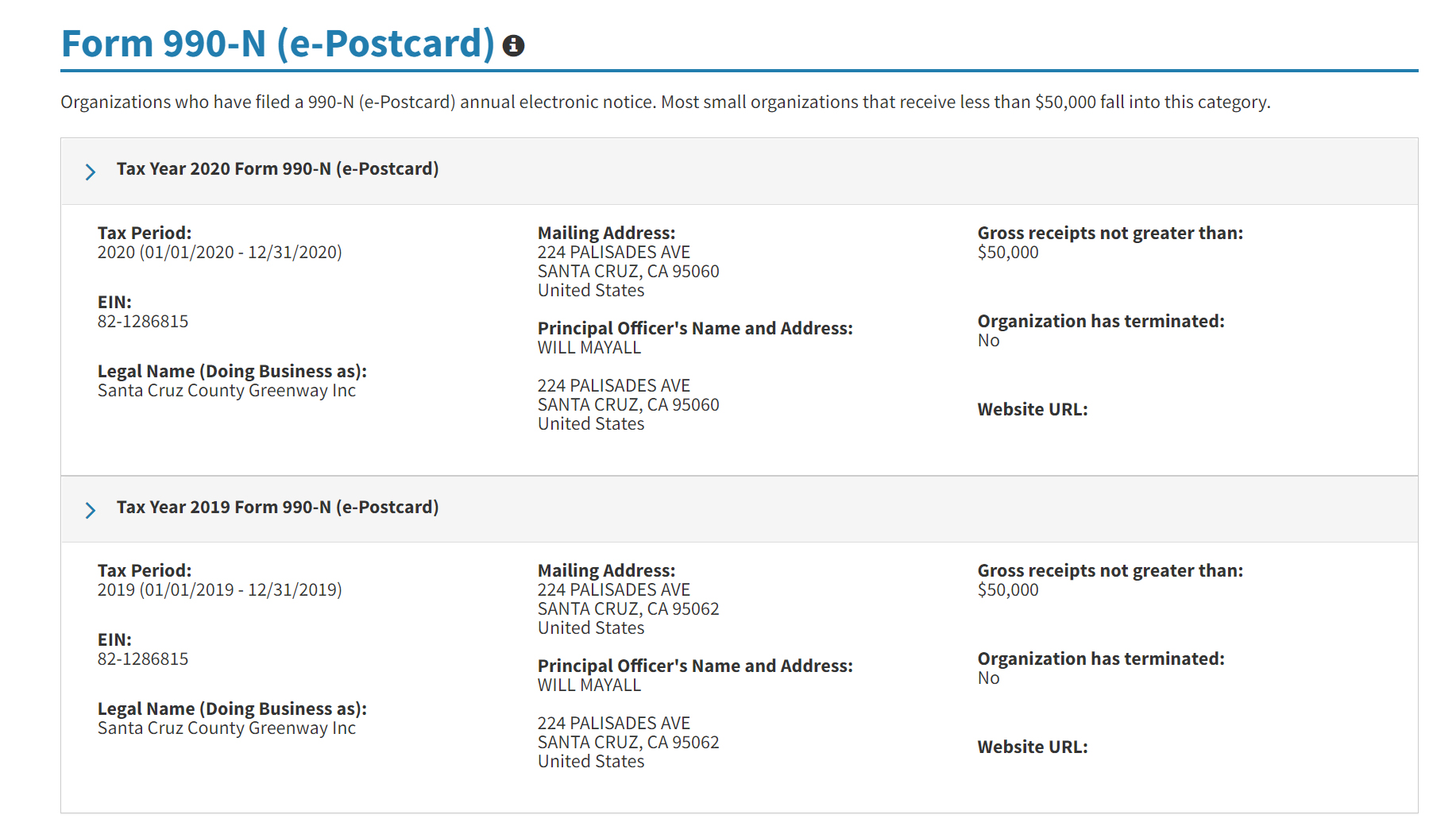 IRS information about Greenway can be found by searching for "Santa Cruz County Greenway Inc" at: https://apps.irs.gov/app/eos/