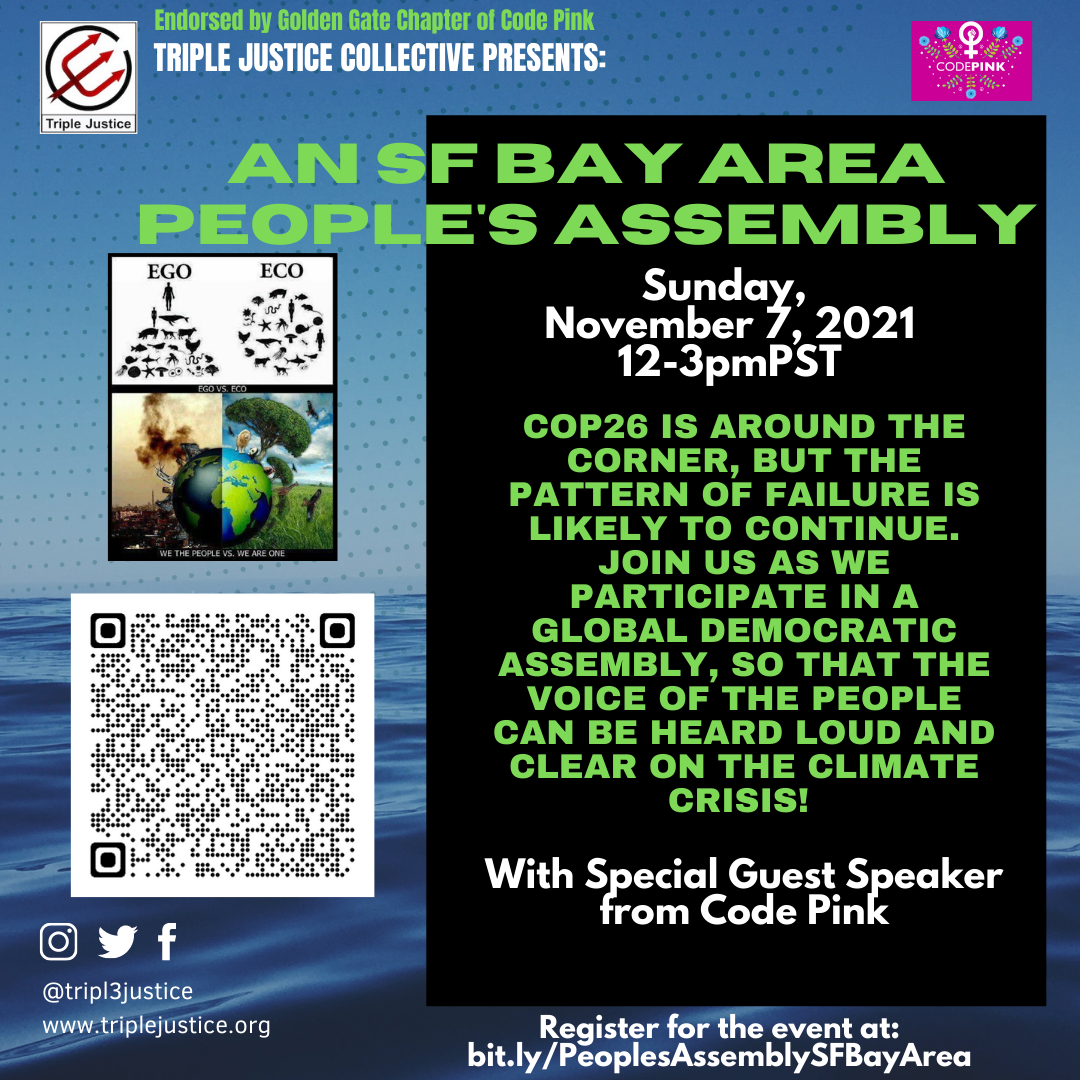 we are joined by http://codepinkgoldengate.org and we are gathering for a people's assembly, Global Assembly is organizing worldwide people’s assemblies, with deliberations among regular people standing in stark contrast to the elite deliberations happening at COP26. Each attempt to answer this question: “How can humanity address the climate and ecological crisis in a fair and effective way?” join us.