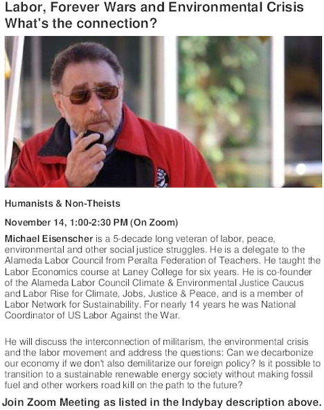 Michael Eisenscher is a 5-decade long veteran of labor, peace, environmental and other social justice struggles. He is a delegate to the Alameda Labor Council from Peralta Federation of Teachers. He taught the Labor Economics course at Laney College for six years. He is co-founder of the Alameda Labor Council Climate & Environmental Justice Caucus and Labor Rise for Climate, Jobs, Justice & Peace, and is a member of Labor Network for Sustainability. For nearly 14 years he was National Coordinator of US Labor Against the War.