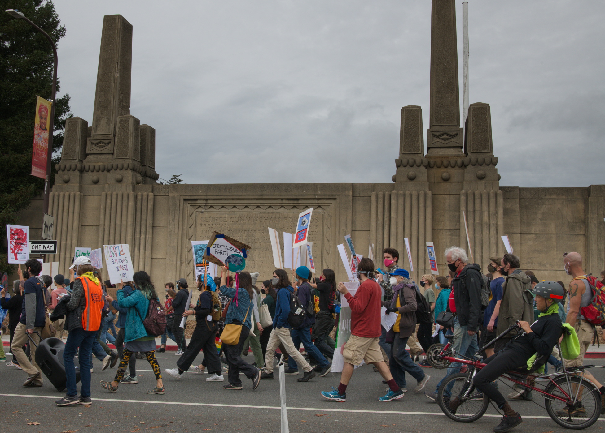 As part of an internation day of solidarity for COP 26, protesters assembled in the Universoty of California Sproul Plaza in Berkeley to make sign and banners. Understanding that their future is on the line, they mobilized to demand action that centers people not fossil fuel billionaire. They marched thorugh several of Berkeley's streets and then down to MLK Civic Center Park where they heard speakers and performers.The emphasis was on climate justice "now" and many wore shirts demanding "more climate action, less hot air." One sign said "the wrong Amazon is burning." Most marchers were college aged though seniors were there too in the event that was organized by 350 Bay Area.