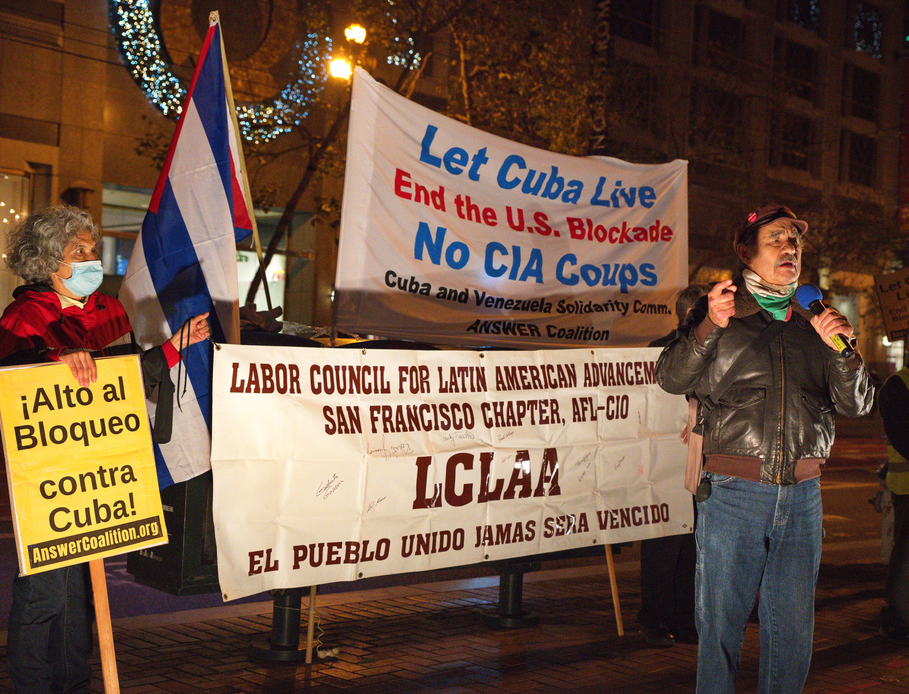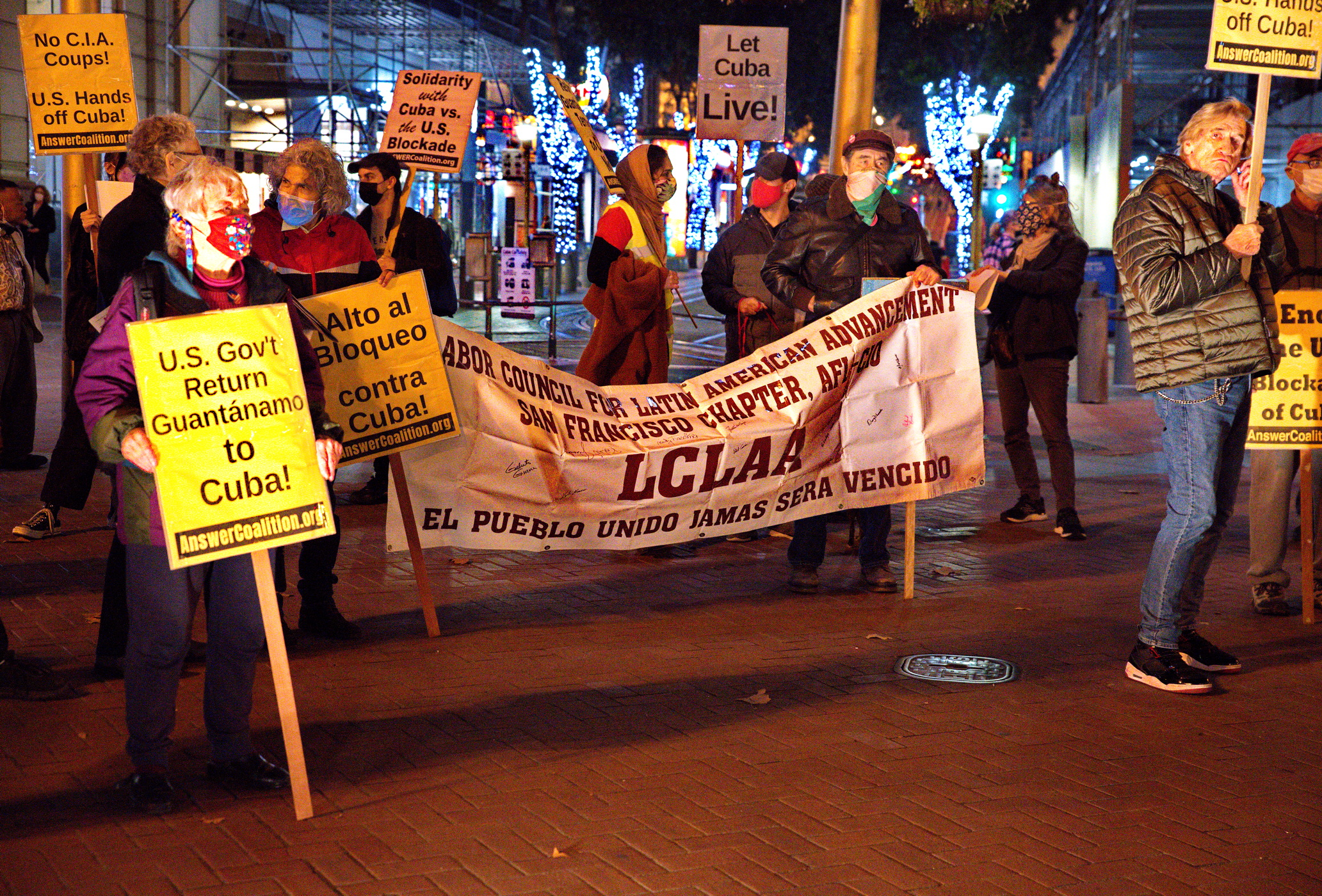 In a main San Francisco downtown shopping area that was desperately trying to project holiday cheer with too few people, Cuba supporters demonstrated to "Let Cuba Live." It was part of a nationwide day of action organized by the Answer Coalition.Since the 1959 Cuban revolution that brought Fidel Castro to power when he ousted the brutal U.S. supported Batista dictatorship and expelled major U.S. corporations (AT&T, United Fruit, and Texaco) the U.S. has been trying to overthrow the independence of the small island nation of 11 million. Cuba has committed the cardinal sin of refusing to become a U.S. client state, fitting into its assigned slot in the U.S. economic world order.