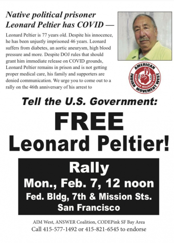 Leonard Peltier is 77 years old. Despite his innocence, he has been unjustly imprisoned 46 years. Leonard suffers from diabetes, an aortic aneurysm, high blood pressure and more. Despite DOJ rules that should grant him immediate release on COVID grounds, Leonard Peltier remains in prison and is not getting proper medical care, his family and supporters are denied communication. We urge you to come out to a rally on the 46th anniversary of his arrest to tell the U.S. government: Free Leonard Peltier!