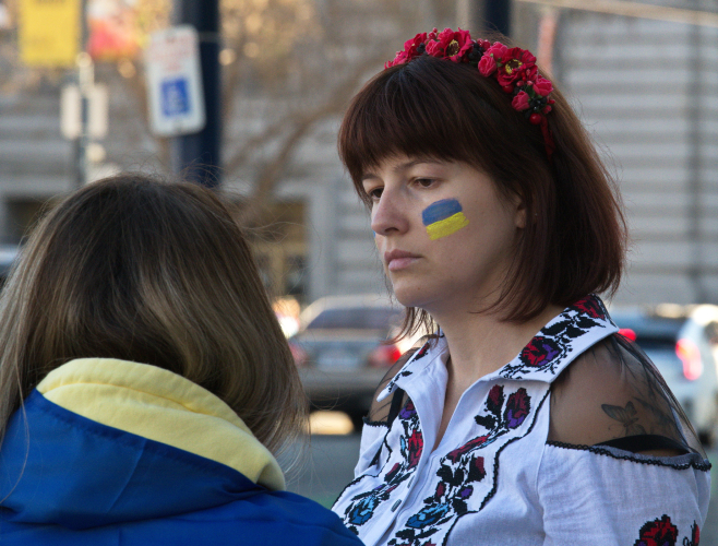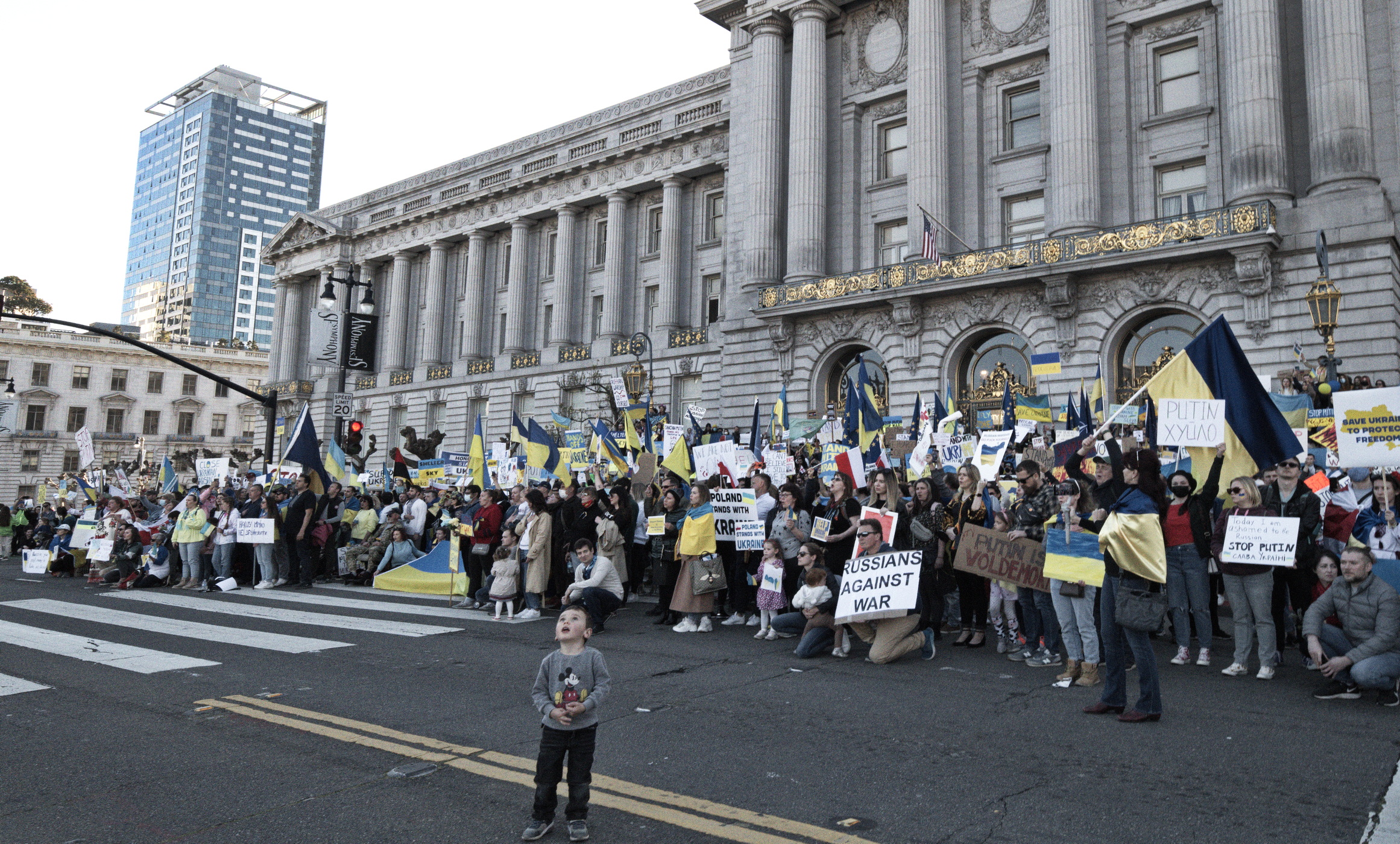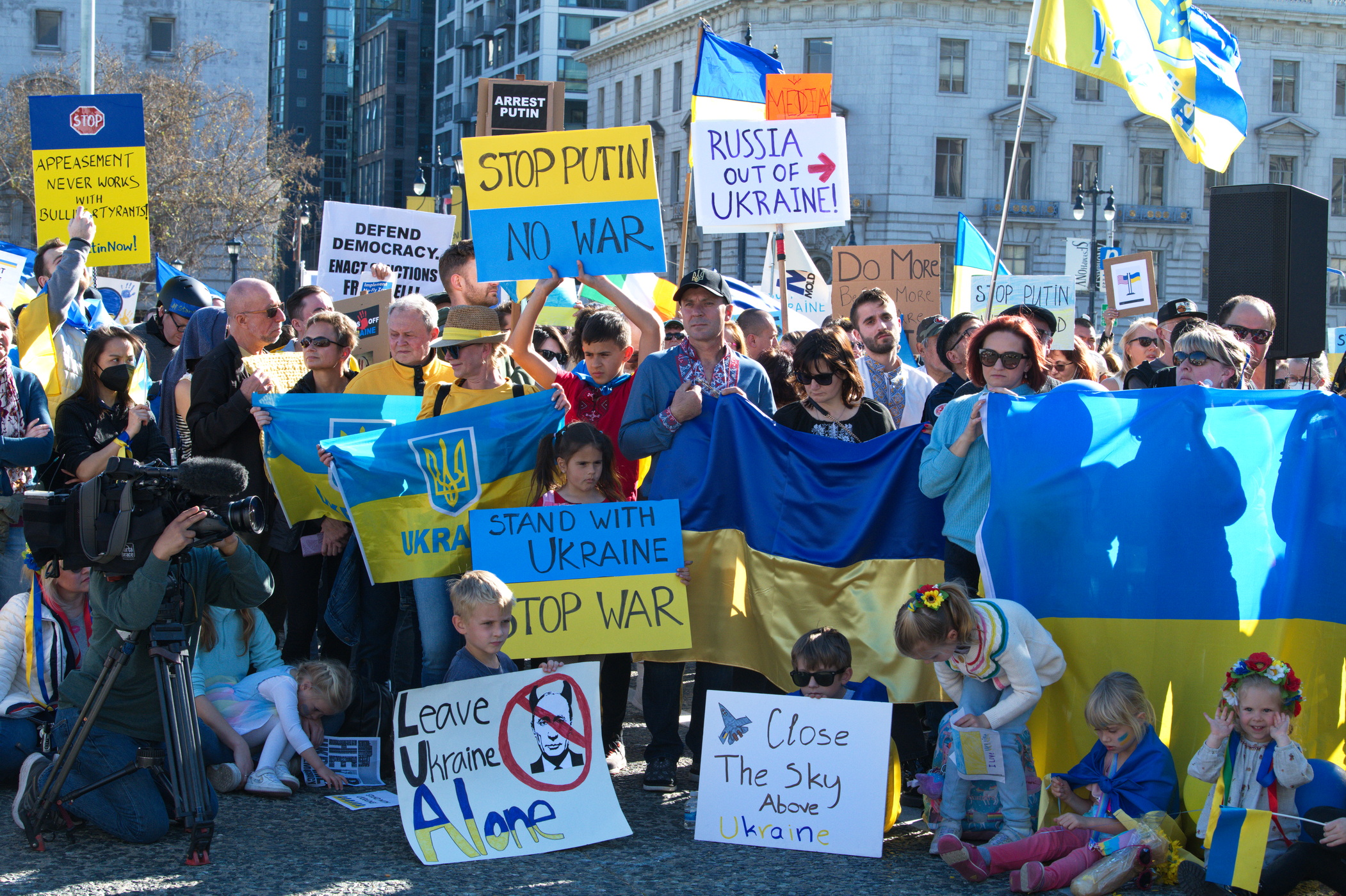 The Ukrainian community's fury at Russian President Putin's invasion of Ukraine was unabated as over 2000, many with their children, rallied in front of City Hall.While grateful for the worldwide support they have received, they demanded to "close the sky", that is, that Ukraine's sky be made a "no fly" zone for Russian aircraft. They asked for explicit armed support from NATO countries and some signs demanded immediate incorporation into the NATO alliance. Recalling how Hitler ended, one sign suggested "Mr. Putin, let's skip to the part where you kill yourself in a bunker".