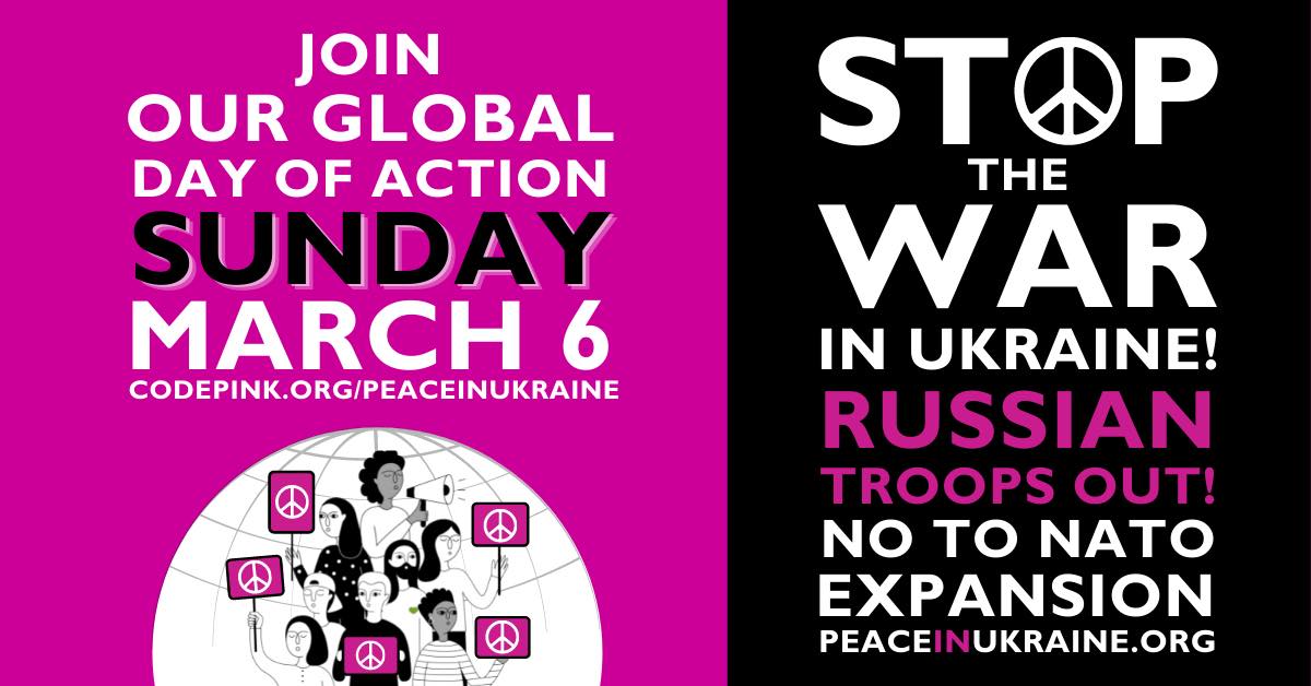 Global Day of Action: Join CODEPINK and friends in San Francisco to say "Stop the War in Ukraine. Russian Troops Out. No to NATO expansion". Help hold banners and posters, distribute informational flyers, and speak out for peace!