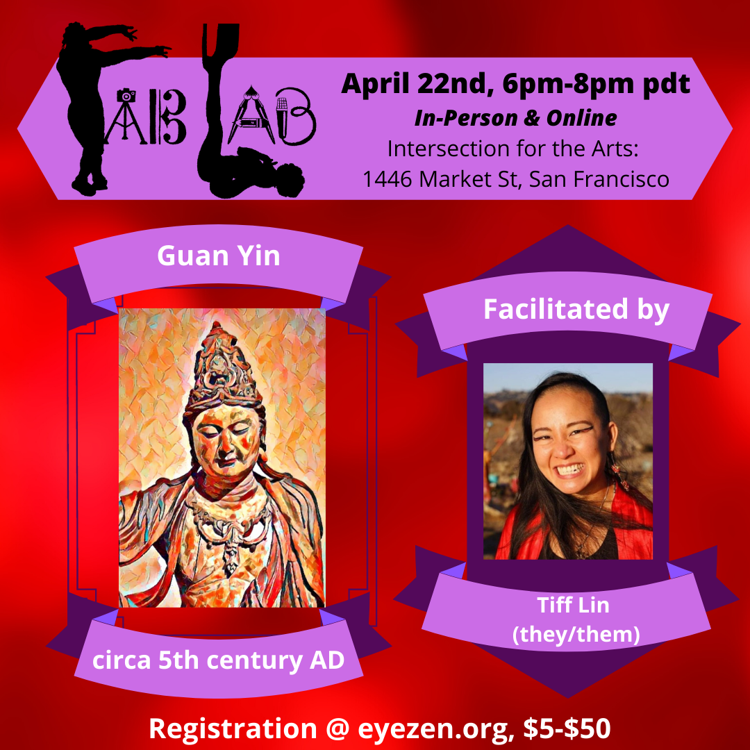 Eye Zen Presents, Latinx Mafia, and SOL VIDA are delighted to announce a hybrid FabLab event, in person at Intersection for the Arts and streaming on Zoom on April 22nd 6-8pm PST. Performer Tiff Lin (they/them) will lead an artistic playshop (playful workshop) on the legacy of gender-flipping Chinese Bodhisattva Guan Yin.This is a hybrid event with both an online streaming option and an in-person gathering located at Intersection for the Arts, 1446 Market St, San Francisco, CA 94102